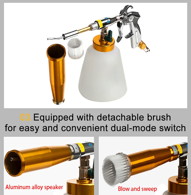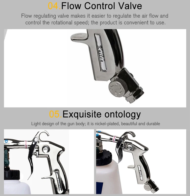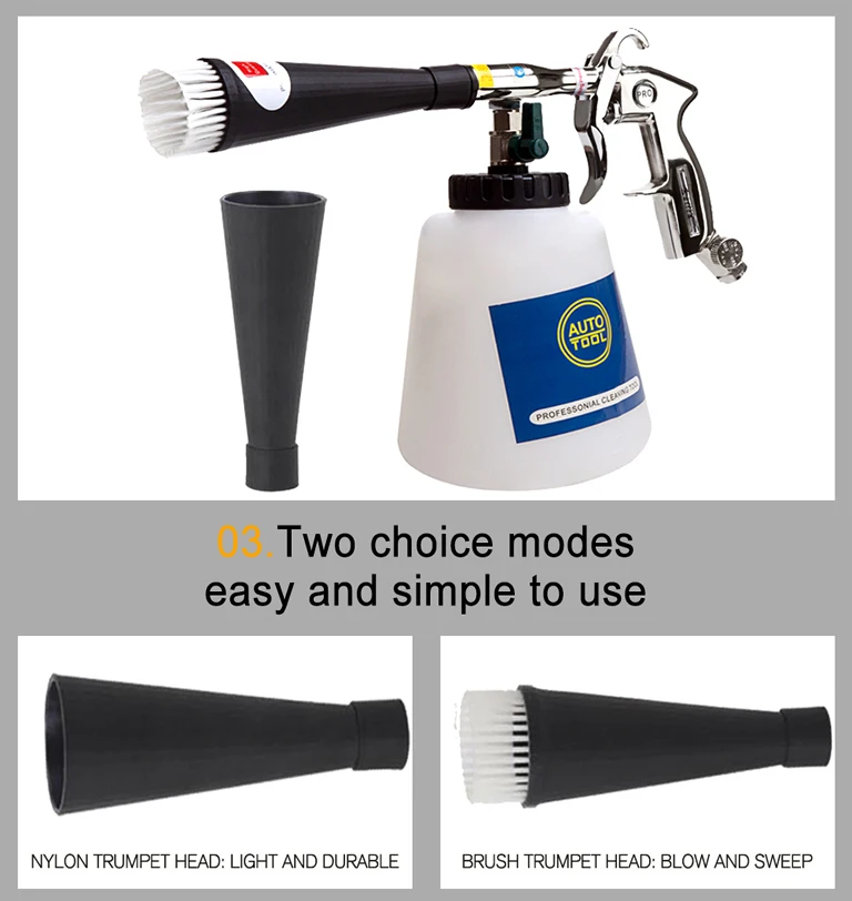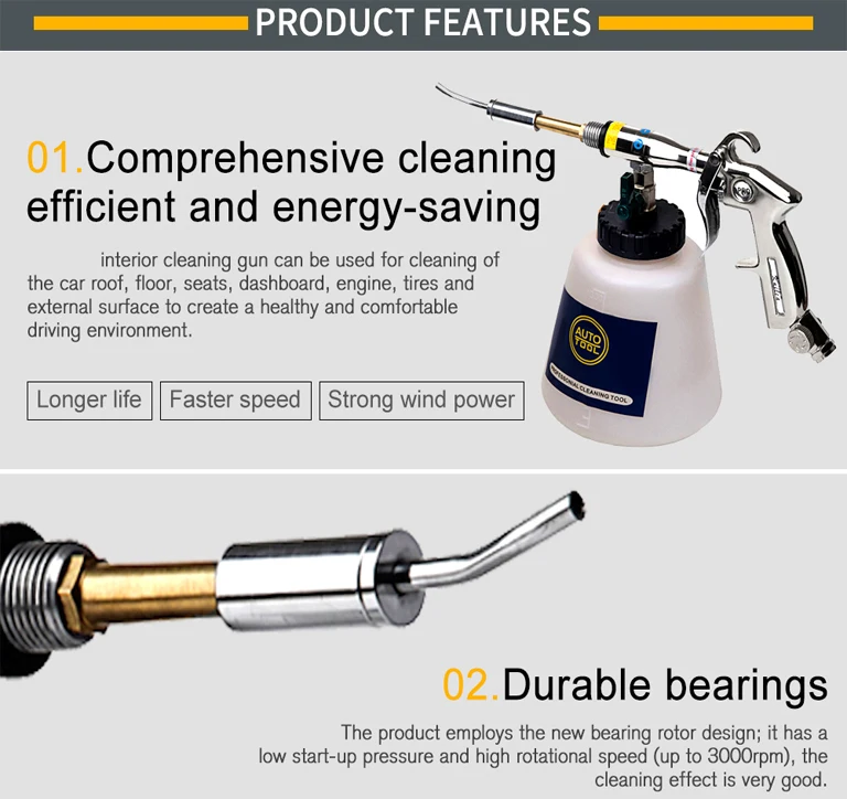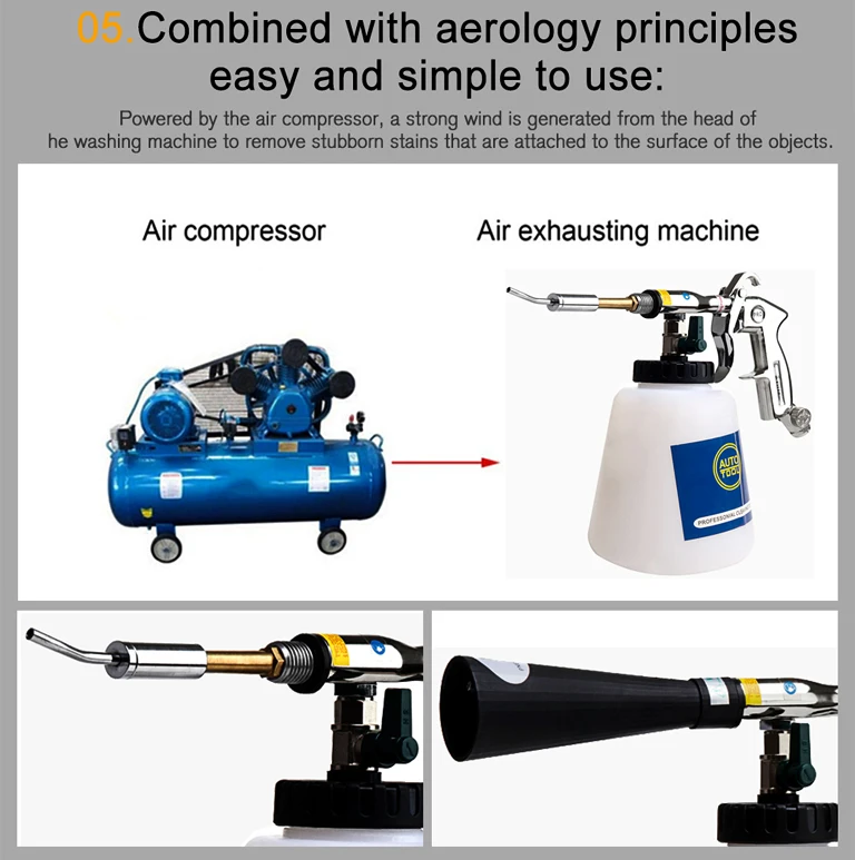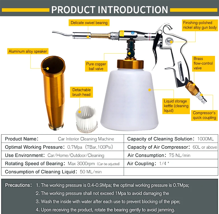 Машинка подключается к воздушному компрессору, и она вращается на собственной оси на высокой скорости внутри чистящего пистолета трубы круглой трубы воздушного компрессора 0,4-0,9мпа (58-130PSI) (Оптимальное рабочее давление 0,7 МПа, оно не должно превышать 1 МПа). Жидкость для очистки создает эффект распыления под сильной центробежной силой, создаваемой высокоскоростным вращением круговой трубы. Распыленная чистящая жидкость прикрепит к пятну и сделает пятна полностью отделенными от поверхности детали. При этом привлекайте радикальные частицы на трубочных насадках, чтобы эффективно удалить пятна; Он также может стерилизовать бактерии в автомобиле.
