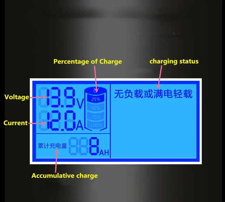Дисплей экрана: напряжение зарядки, ток зарядки, емкость аккумулятора, аккумулятор, состояние зарядки