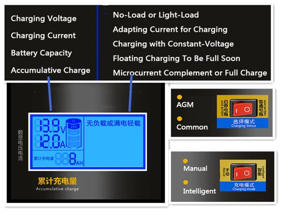 Зарядное устройство автоматически регулирует зарядный ток, останавливает входной ток при полном объеме, прост в эксплуатации.