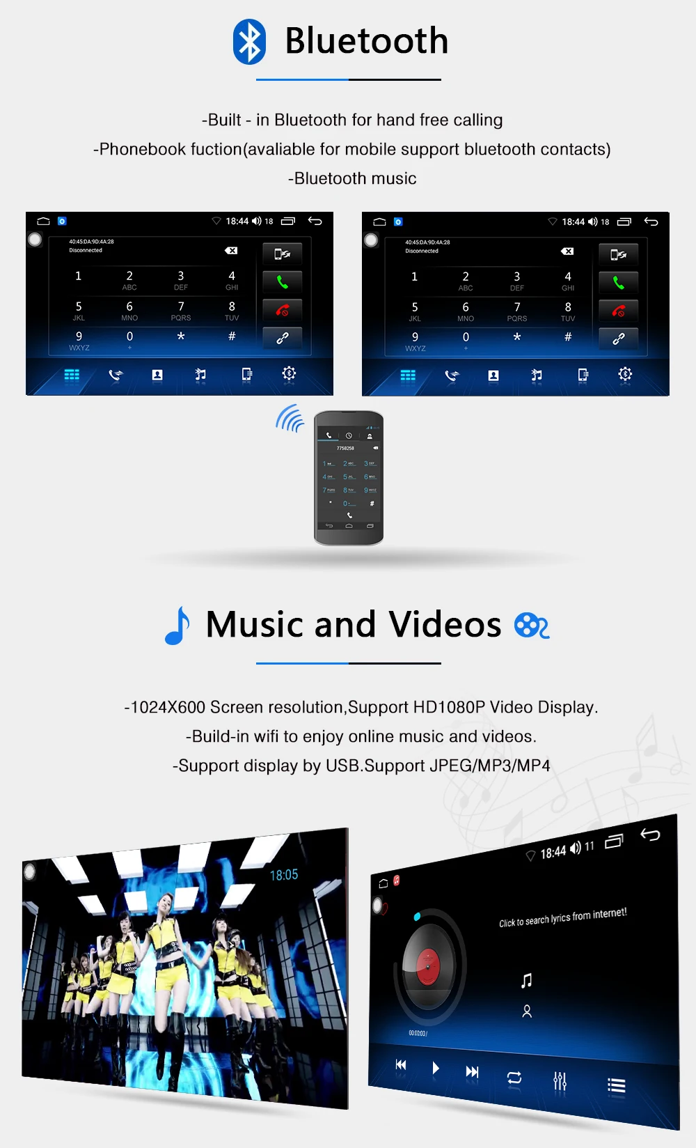 Поддержка Bluetooth звонков и Bluetooth книг Поддержка Bluetooth/USB/онлайн для воспроизведения музыки, видео и передачи файлов