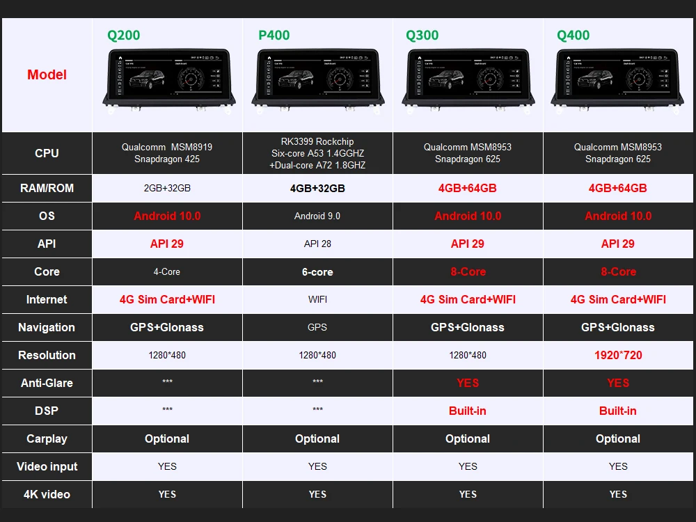Ключевые особенности:-Новейший 10,25 дюймовый супер широкий экран с оригинальным дизайном пользовательского интерфейса.-1920*720 супер HD 7 цветов анти-Glore Супер Разрешение дисплей (доступно только Q400)-P400: RK3399 PX6, ОС Android 9,0, шесть ядер, 4 Гб RAM и 32 Гб ROM,1280*480 HD (Вариант 1)-Q200: Qualcomm,Android 10,0 OS, четырехъядерный процессор, 2 Гб ОЗУ и 32 Гб ПЗУ, 1280*480 HD (Вариант 2)-Q300: Qualcomm,Android 10,0 OS, четырехъядерный процессор, 4 Гб ОЗУ и 64 Гб ПЗУ, 1280*480 HD (Вариант 3)-Q400: Qualcomm,Android 10,0 OS, четырехъядерный процессор, 4 Гб ОЗУ и 64 Гб ПЗУ, 1920*720 HD (Вариант 4)-Встроенный WIFI + 4G Функция sim-карты (Используйте телефонную карту)-Встроенный Bluetooth Hands free, BT-Music может достичь CD-типа и близкого к качеству звука без потерь.-Встроенный GPS, USB, TF, радио, RDS, WiFi, часы, калькулятор, календарь.-Поддержка управления рулевым колесом (Мультимедийные кнопки)-Поддержка DAB +, Carplay,DVB-T/T2, TPMS, OBD2, DVR, камера (исключается)