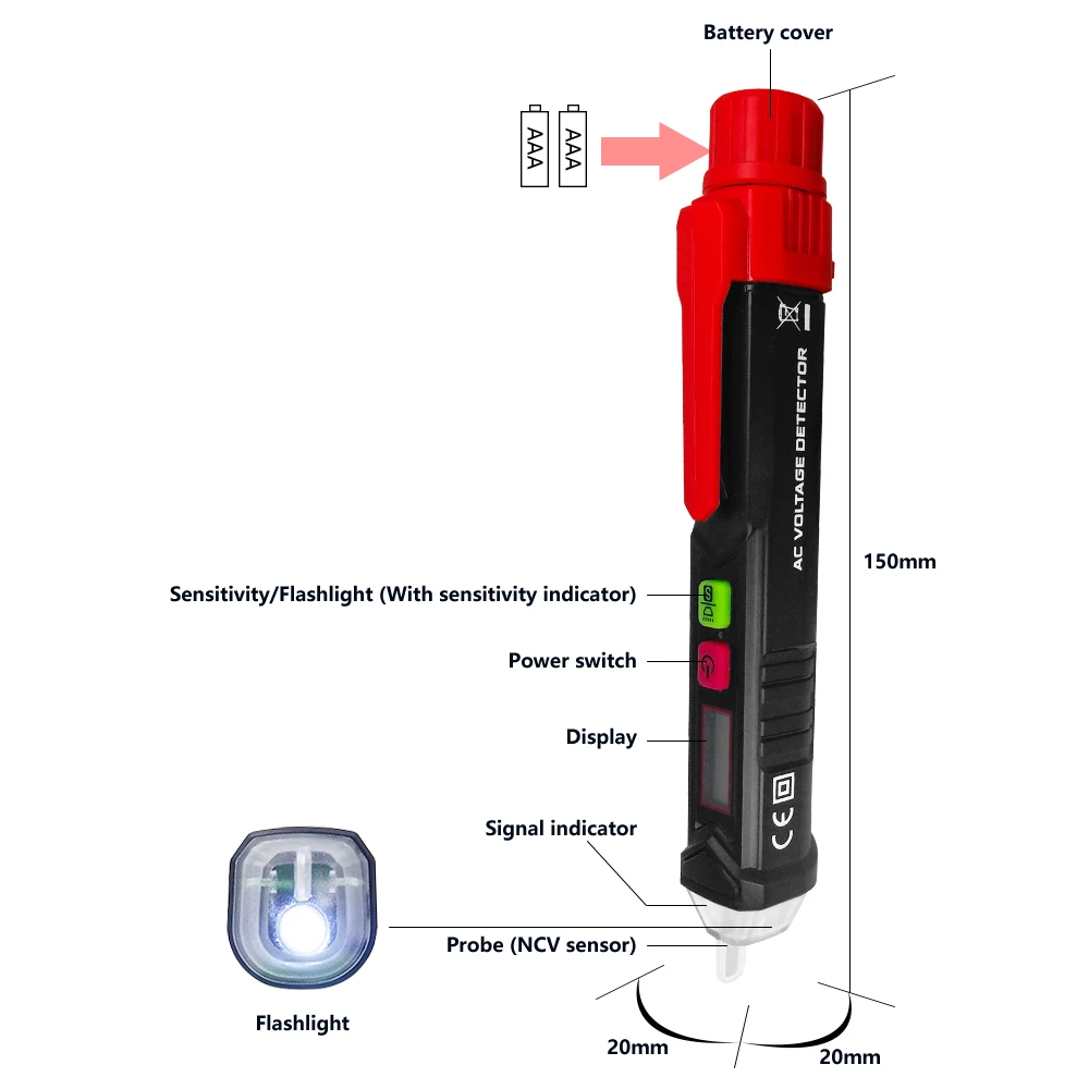 Регулируемая чувствительность: Двойной диапазон 12 В-1000 В/48В-1000 В-Выберите различный диапазон в соответствии с вашими потребностями Различный тест напряжения и двухдиапазонный тест-различение живого и нулевого провода через различный сигнал тревоги частоты; По умолчанию диапазон измерения напряжения переменного тока составляет 48-1000 В, он также может измерить 12-1000 В, регулируя чувствительность. Который удовлетворяет потребности в выборе наиболее подходящей чувствительности перед тестированием в различных случаях и различных объектов. Бесконтактный Тестер Напряжения-он будет мигать и звуковой сигнал, когда устройство близко к напряжению переменного тока больше во время указанного диапазона напряжения без прикосновения к измеряемому объекту, А также с звуковым сигналом и светодиодный индикатор для поддержки достаточно безопасного измерения Светодиодный светильник и Индикатор низкого напряжения-яркий светодиодный индикатор низкого напряжения и сигнал тревоги могут предупредить вас о необходимости вовремя заменить аккумулятор, в то время как белый светодиодный светильник позволяет работать даже в темной среде; автоматическое отключение питания после бездействия в течение 5 минут для экономии энергии Безопасный звук и светильник с частотой напряжения можно отличить звуковым сигналом и светодиодный индикатор. Он достаточно громкий, чтобы услышать умеренный шум машинного оборудования. Маленький размер, легко хранить в ящике для инструментов или носить с собой в кармане