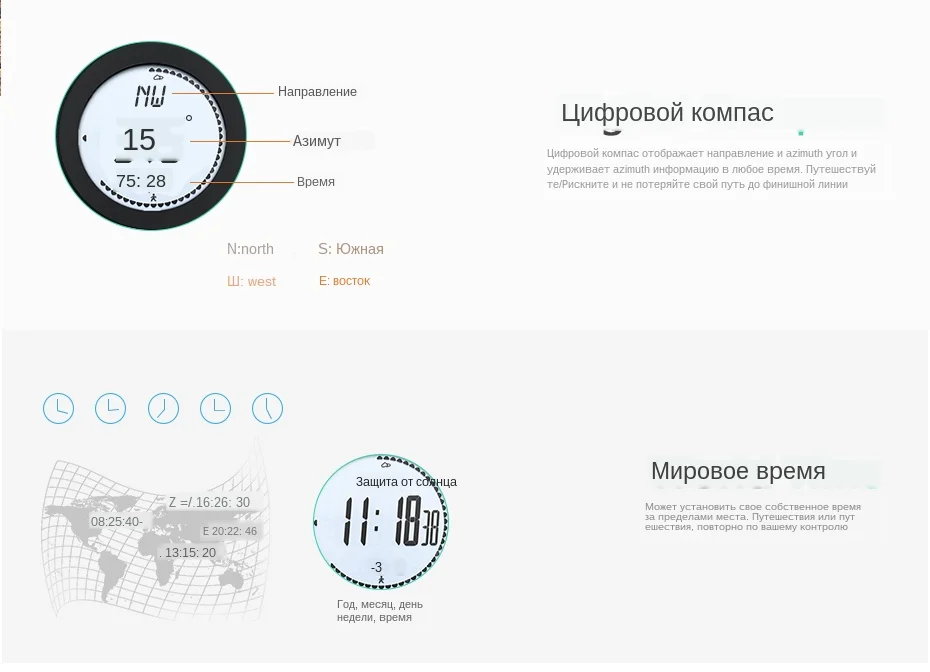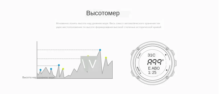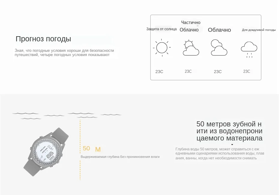 Эти часы имеют высотомер, барометр, термометр и компас. Измеряет высоту, давление воздуха, температуру, направление и размер шага. Он имеет функцию времени, функцию напоминания о тревоге, функцию обратного отсчета, функцию секундомера, отображение второго времени, Время восхода и захода солнца, тренд изменения давления воздуха, вид кривой давления воздуха (последние 48 часов), семидневная высота, хранение и просмотр давления воздуха, общее время подъема/падения, высота, Запись скорости, Запись истории данных, функция подсветки EL highlight, водонепроницаемая функция 50 метров. Пожалуйста, прочитайте инструкции перед использованием часов. Избегайте подвергать часы экстремальным условиям. Грубое использование или сильное воздействие на часы. Не открывайте чехол для часов, если у вас нет сертифицированного сервисного центра, так как ваш прогноз погоды содержит точную электронику. Датчики и компоненты периодически чистят часы мягкой тканью, чтобы продлить срок службы часов. Держите часы подальше от магнитов или приборов, сотовых телефонов, динамиков и моторов. Когда часы не используются, храните их в сухом месте. Если вам нужны другие часы или другие дети, дамы, мужчины, старшие, художественные часы, пожалуйста, перейдите в магазин, чтобы посмотреть или связаться с владельцем. Если вам нужен китайский продукт вместо часов, вы также можете связаться с владельцем.
