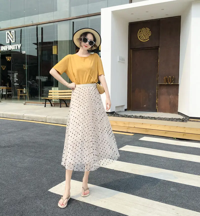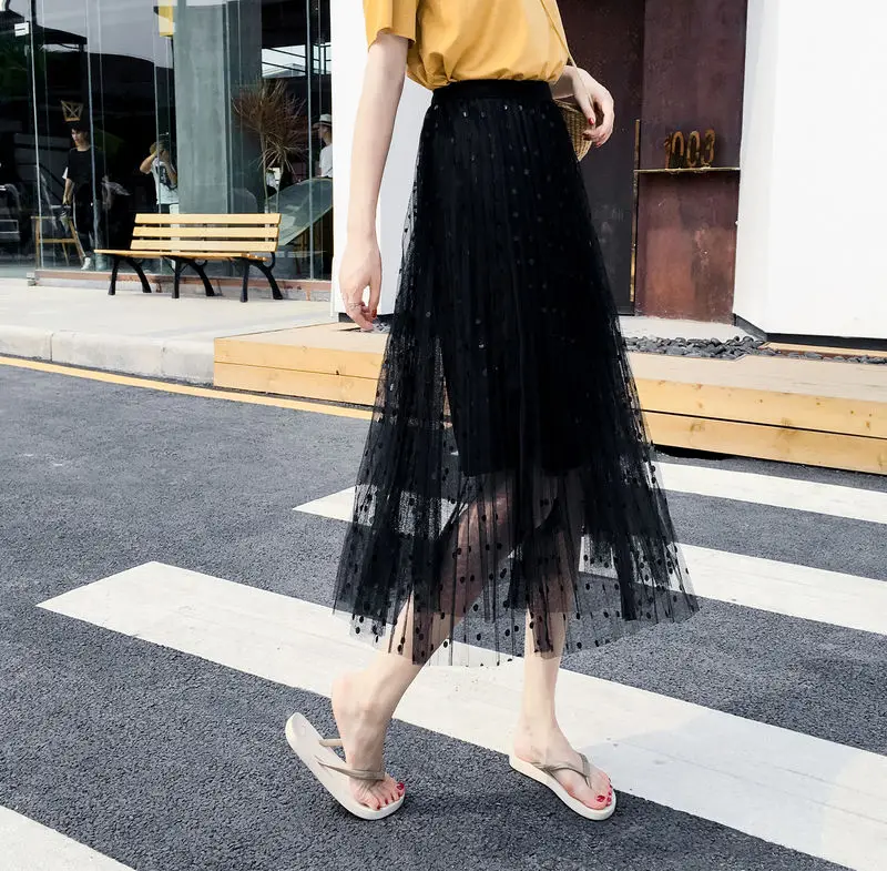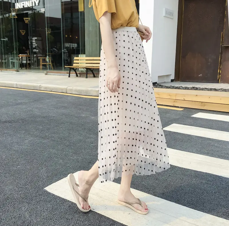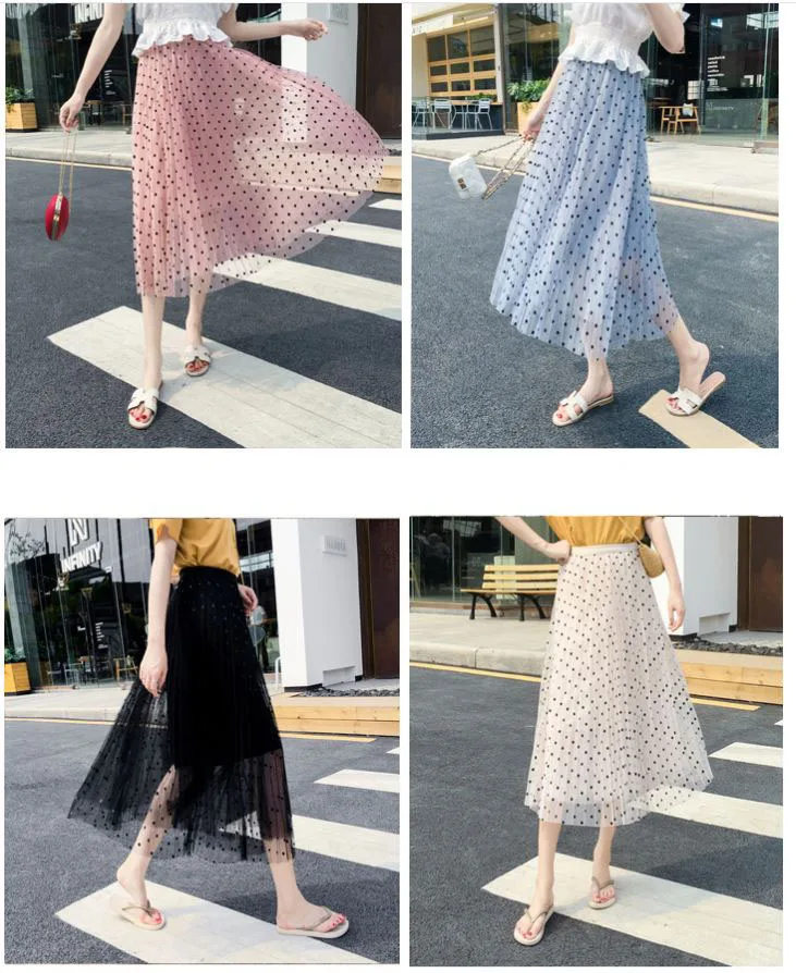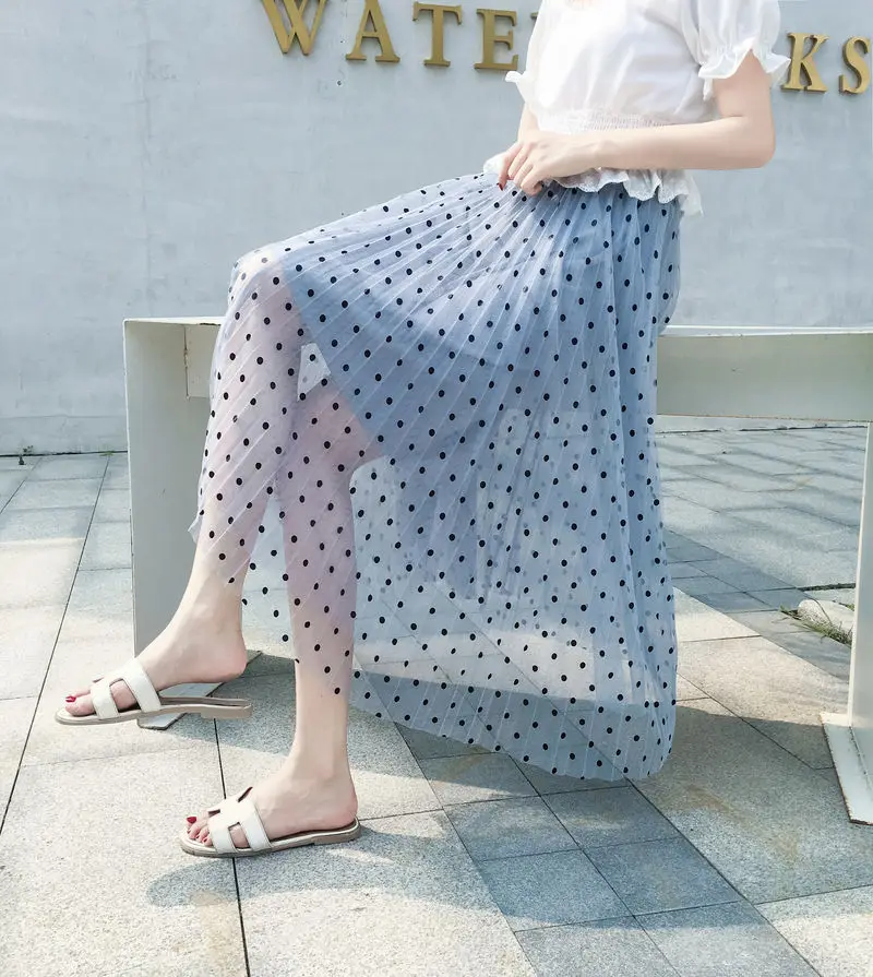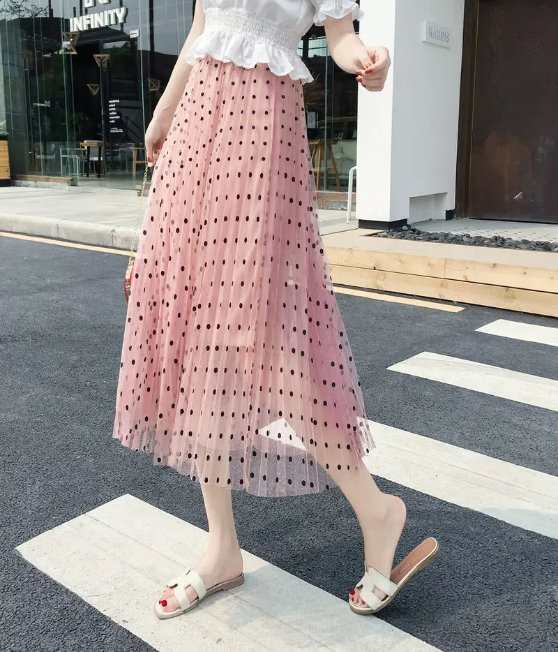 Женская фатиновая юбка в горошек TingYiLi, гофрированные длинные юбки с высокой талией, черно-белые, серые, розовые юбки-макси в Корейском стиле для весны и лета