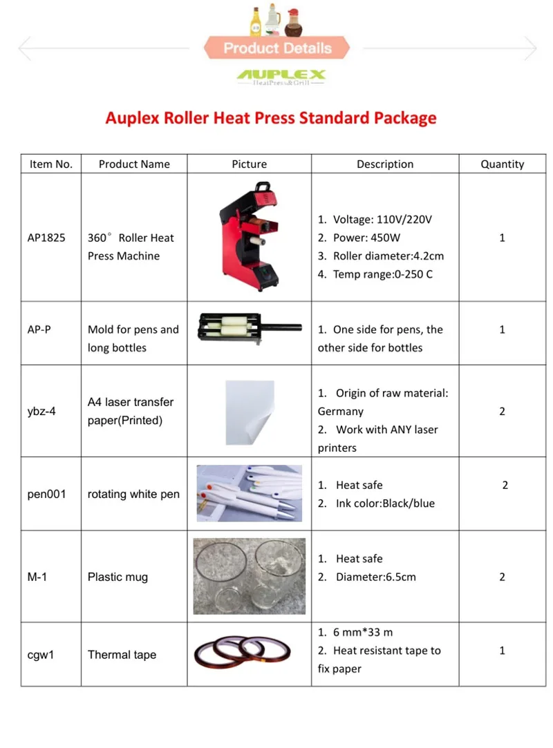 Профессиональный рулон машина сублимационный тепловой пресс для обычных материалов кружки ручка все в 1 Модернизированный роликовый тепловой пресс AP1825 Модель AP1825 Напряжение 110В/220В Мощность 750 Вт Диапазон времени 0 s-999 S Максимальная температура 0-250 ℃ Область печати разного размера кружки и ручки Характеристика подходит для всех видов материалов, Не просто изделия с сублимационной печатью!