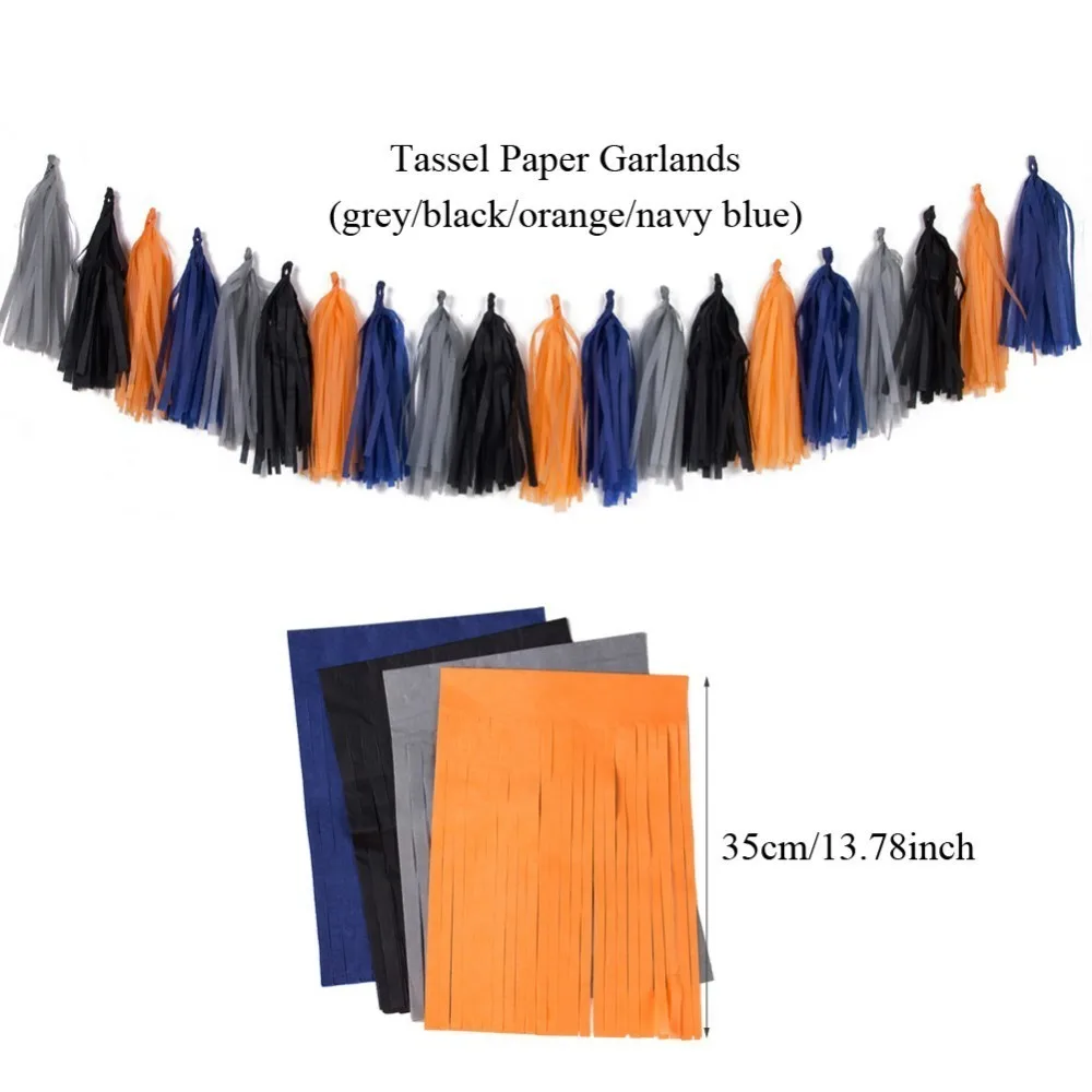 • 4 упаковки гирлянды с кисточками 35 см (1 упаковка темно-синего цвета, 1 шт. серого цвета, 1 шт. черного цвета, 1 шт. оранжевого цвета).