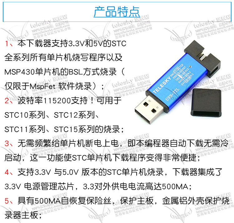 1, этот загрузчик поддерживает 33 и 5v sTCВсе серии одночиповых программ программирования иMSP430 MCU BSL режим горения (Ограничено только поддержкой программного обеспечения MspFet);2. Поддержка скорости передачи данных 115200! Может быть использованСерия STC10, серия STC12,Сжигание серии STC11 и серии STC15;3, не нужно часто отключать микрокомпьютер с одним чипом, то есть программист автоматически загружает без холодаЗагрузки, эта функция делает STc микроконтроллер загрузки программы очень удобным;4, поддержка 3,3 & or; И 5,0 версия STC микроконтроллера горения, интегрированный загрузчик33 & or; Чип управления питанием, 3,3 внешний источник питания тока до 500 ма;5, с предохранителем для самоизвлечения 500 ма, защита материнской платы, защита металлического алюминиевого корпусаРегистраторы материнская плата6. Определение интерфейса напечатано на внешнем корпусе;7. При сжигании STC MCU, после загрузки, светильник индикатора погаснет.Он обычно мигает при передаче данных, и он всегда горит, когда нет передачи данных;8, поддержка WN7 системы совместим со следующими систем, поддержка 64-разрядных систем.