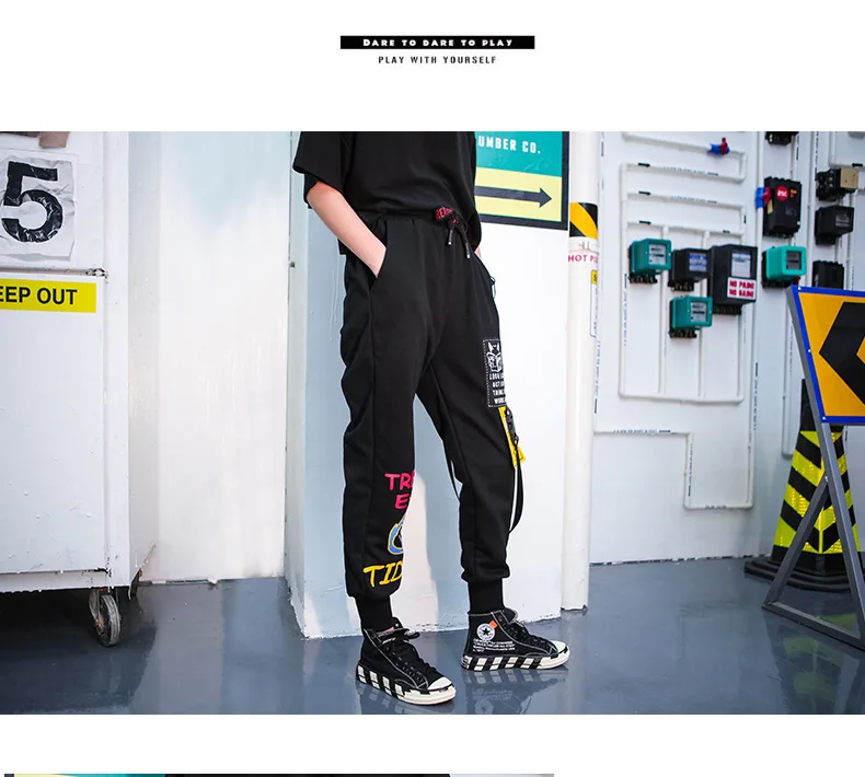 Цин MO 2019 Весна женский, черный эластичные штаны-шаровары Street натуральный хлопок хип-хоп буквы-каракули печати Для женщин штаны-шаровары