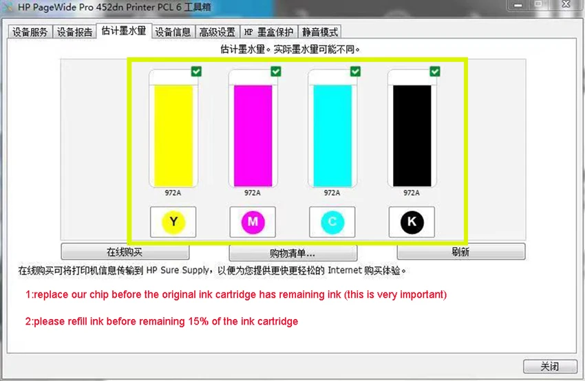 1: Пожалуйста, убедитесь, что ваш принтер не запрашивает систему чернил для ошибки. Один или несколько картриджей с чернилами были истощены, если ваш принтер запросил вышеуказанное сообщение об ошибке. Перед использованием этого продукта, пожалуйста, положите оригинальный картридж, который может использоваться обычно в принтере и повторно включите принтер. После первой миссии. Если принтер может печатать нормально, продукт может использоваться нормально. 2: Пожалуйста, обратите особое внимание на уровень чернил этого картриджа. Когда чернила около 10%, они должны быть заполнены вовремя. Во избежание блокировки картриджа. Принтер подскажет системе чернил сбой или чернила иссякнут.