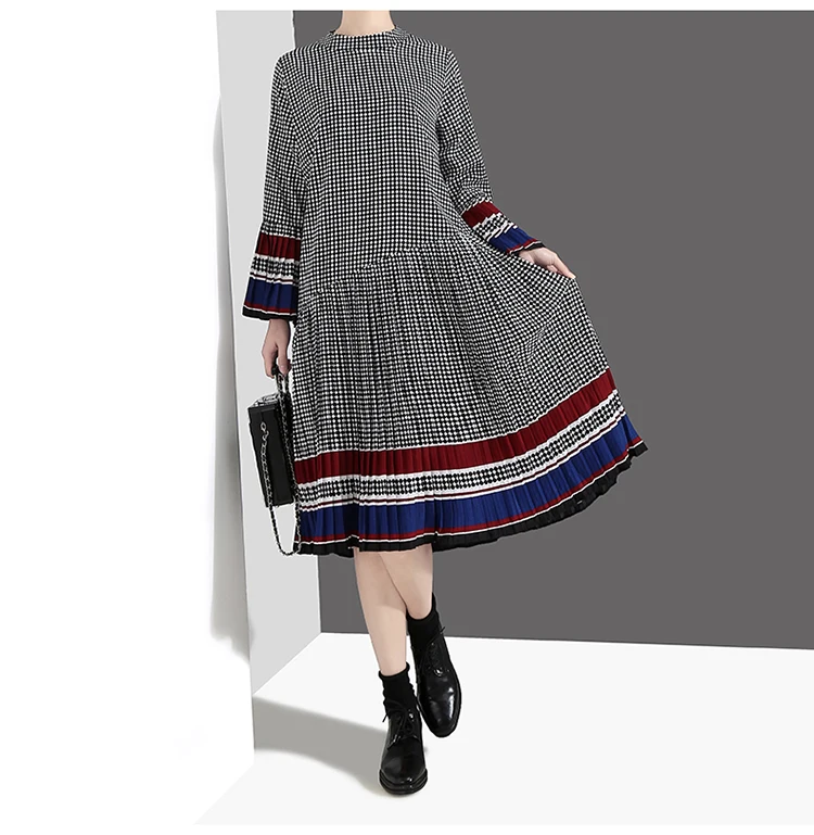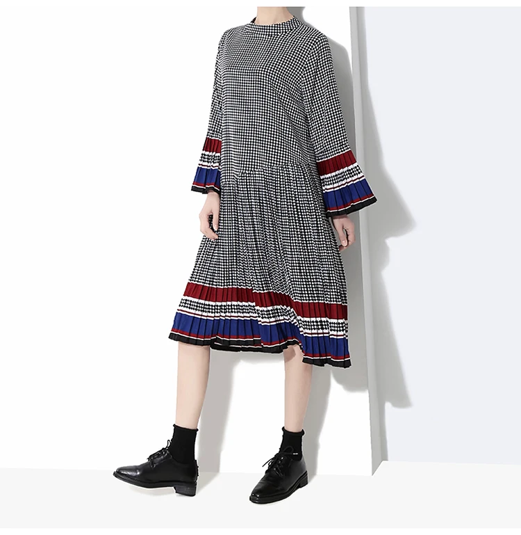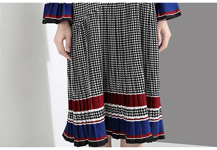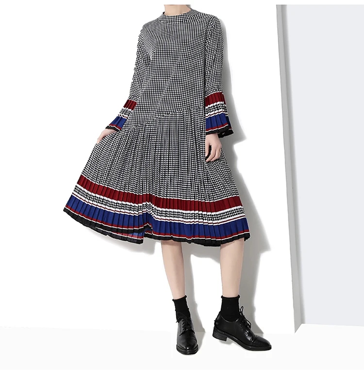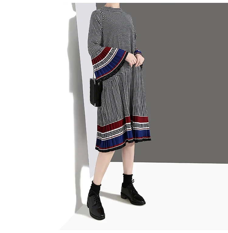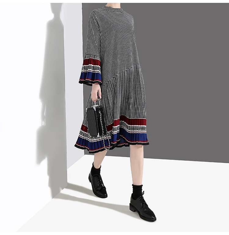 Новинка, женское элегантное черное платье в клетку с длинным рукавом, плиссированное прямое офисное повседневное милое платье средней длины, женский стиль 4629