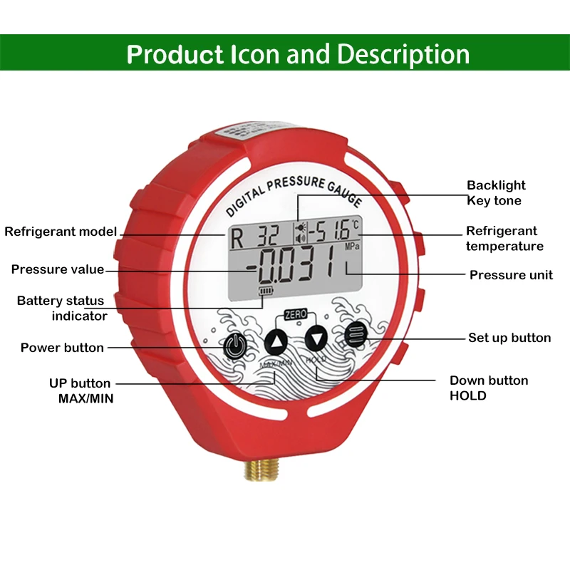 1. Цифровой хладагента манометры изготовлены из самую последнюю микрокомпьютер контроллеры 24 бит AD проводились непрерывные разработки преобразователей и высокоточные датчики давления. Он не только может точно измерить давление газа и жидкости, но также может измерить вакуумное давление. 2. Манометр не имеет подвижных частей, поэтому он имеет длительный срок службы, высокую точность измерения и хорошую долговечность. 3. Он содержит параметры давления и температуры общего хладагента, а измеренные параметры холодильной системы, такие как давление, температура конденсации, температура испарения и так далее, ясны с первого взгляда. 4. Широко используется в холодильном оборудовании, кондиционер холодильные инструменты, измерение давления семян снега, вакуумное оборудование, пневматическое оборудование и другие гидравлические, пневматические измерения случаев.