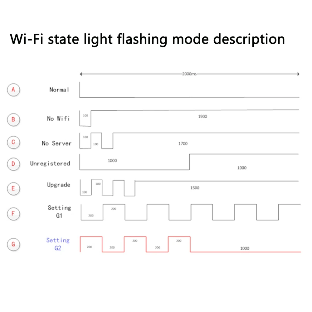 F. Настройка G1: означает, что устройство находится в режиме A.P. Режим конфигурации используется для устройств, чтобы получить необходимую информацию для приложения мобильного терминала, чтобы присоединиться к сервисной сети, включая ssid маршрутизатора, пароль, ip сервера, номер порта и т. Д.