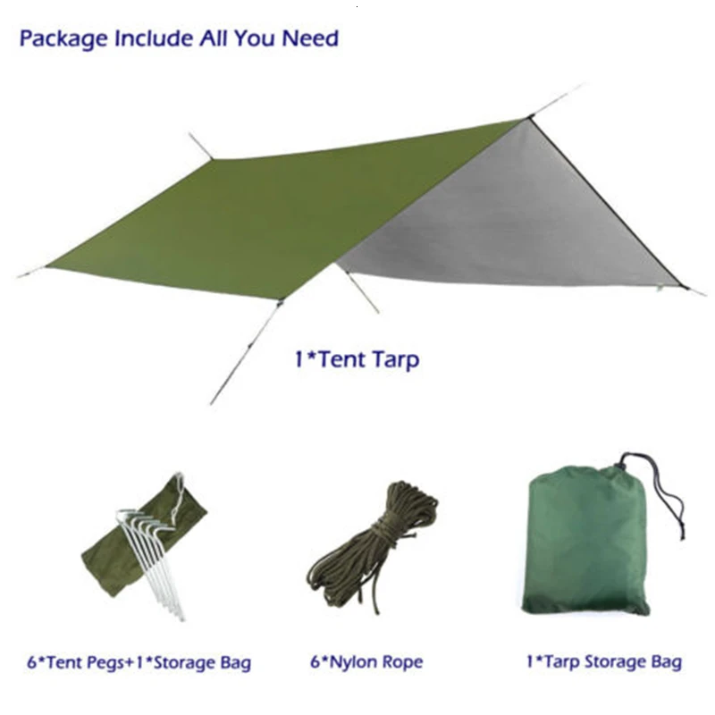 Его можно использовать как тент для кемпинга, тент для дождя, тент для рюкзака, тент для парусника, брезент для гамака, дождевик, тент для пляжа/парка, коврик для пикника, пляжное одеяло для пастбища, простая палатка и т. д. Наслаждайтесь отдыхом на открытом воздухе, не беспокойтесь!