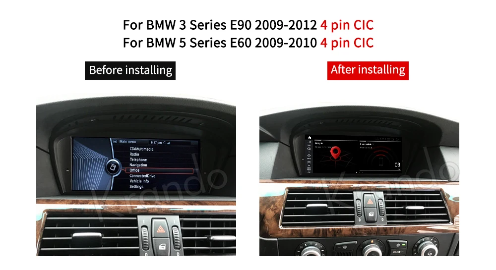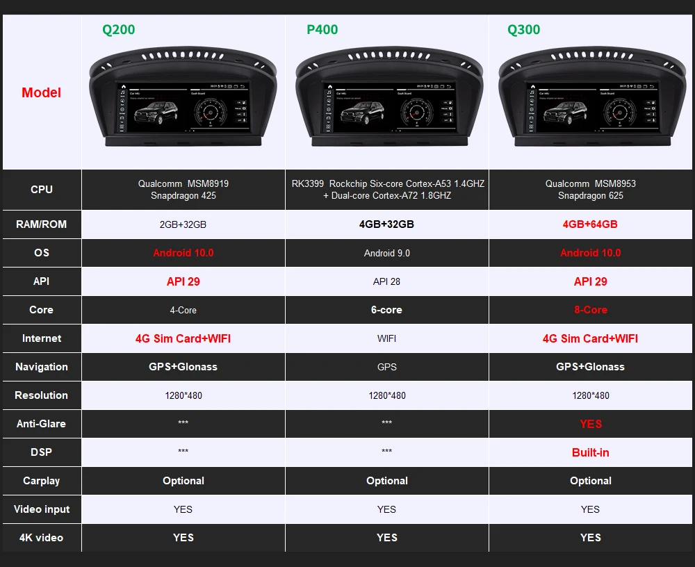 Ключевые особенности:-Новейший 8,8/10,25 дюймов супер широкий Экран с Оригинальный дизайн пользовательского интерфейса.-Экран с разрешением 1280*480 Super HD 7 цветов-P400: RK3399 PX6, ОС Android 9,0, шесть ядер, 4 Гб RAM и 32 Гб ROM,1280*480 HD (Вариант 1)-Q200: Qualcomm,Android 10,0 OS, четырехъядерный процессор, 2 Гб ОЗУ и 32 Гб ПЗУ, 1280*480 HD (Вариант 2)-Q300: Qualcomm,Android 10,0 OS, четырехъядерный процессор, 4 Гб ОЗУ и 64 Гб ПЗУ, 1280*480 HD (Вариант 3)-Встроенный WIFI + 4G Функция sim-карты (Используйте телефонную карту)-Встроенный Bluetooth Hands free, BT-Music может достичь CD-типа и близкого к качеству звука без потерь.-Встроенный GPS, USB, TF, радио, RDS, WiFi, часы, калькулятор, календарь.-Поддержка зеркальной связи с iPhone через WiFi и с Android смартфоном через USB или WiFi.-Поддержка управления рулевым колесом (Мультимедийные кнопки)-Поддержка DAB +, Carplay,DVB-T/T2, TPMS, OBD2, DVR, камера (исключается)Наши ключевые особенности Bmw:-Поддержка оригинальной информации и функций автомобиля (заводское радио, Bluetooth,DVD/CD,USB,SD и т. д.)-Поддержка заводской камеры заднего вида или 360 камеры.-Информация об открывании двери.-Поддержка оригинального джойстика idrive контролирует наш экран.-Поддержка оригинальной звуковой системы и оптического волокна, воспроизведение аудио без потерь.Установка для автомобиля:Тип 1: Подходит для BMW серии 3 E90 E91 E92 2005-2008 и серии 5 E60 E61 E63 E64 2005-2008Хост CCCТип 2: Подходит для BMW серии 3 E90 E91 E92 2009-2012 и серии 5 E60 E61 E63 E64 2009-2010Хост CICЕсли у вашего автомобиля нет функции AUX AUDIO, у вас есть 2 решения для решения звука.Вариант 1: Вы можете посетить местную мастерскую BMW. Только у BMW есть программное обеспечение, которое может работать с aux. (Качество звука сохраняет оригинальность)Вариант 2: Вы можете купить extranal fm-передатчик. (немного потеряет качество звука)Важное примечание:Пожалуйста, проверьте оригинальную приборную панель автомобиля и внешний вид, прежде чем сделать заказ, чтобы избежать ошибки, если вы не уверены, что это устройство подходит для вашего автомобиля или нет, пожалуйста, пришлите нам свою реальную картинку приборной панели автомобиля, мы подтвердим это для вас.