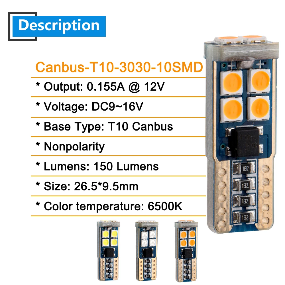 Напряжение: 12 ВМощность: 12V * 0.155AТип основания: T10 Canbus/постоянная неполярностьЛюмен: 150 лмРазмеры: 26,5*9,5 ммЦветовая температура: 6500KВес нетто 0,16 кг/100 штПосылка включает: 4pcsT10 Canbus 3030 10 SMD