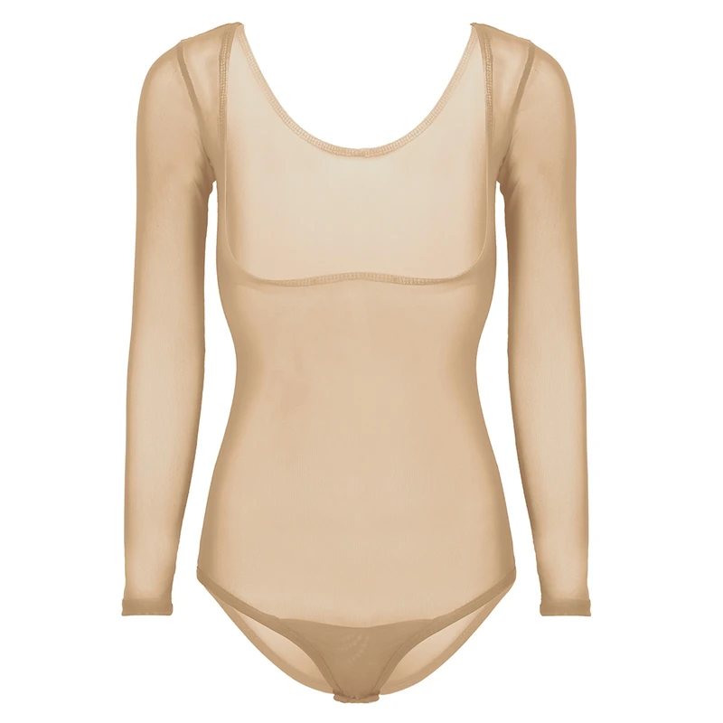 Длинный рукав, открытый бюст, высокий крой, сетчатый прозрачный дизайн, промежность с застежкой на пуговицы.