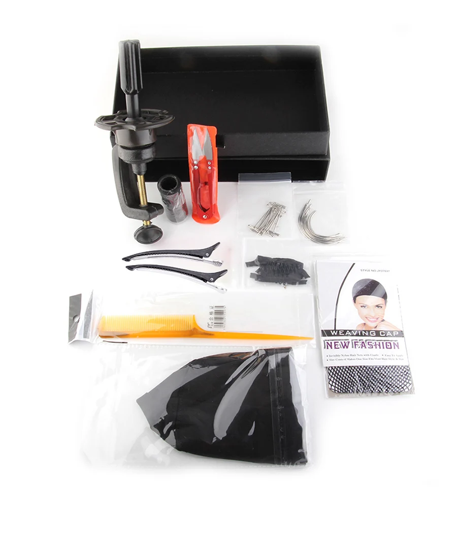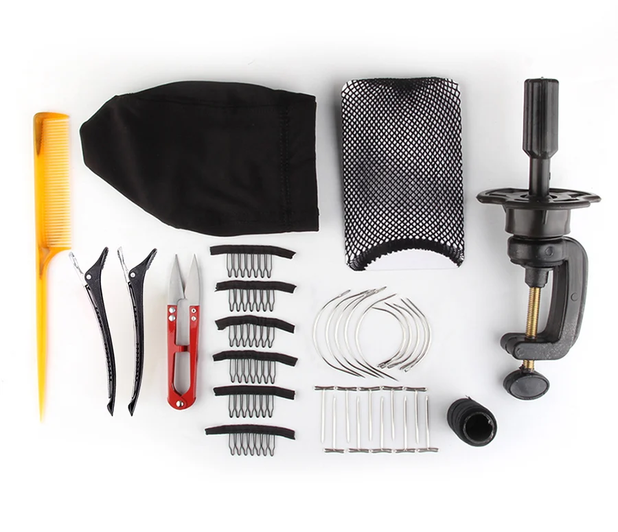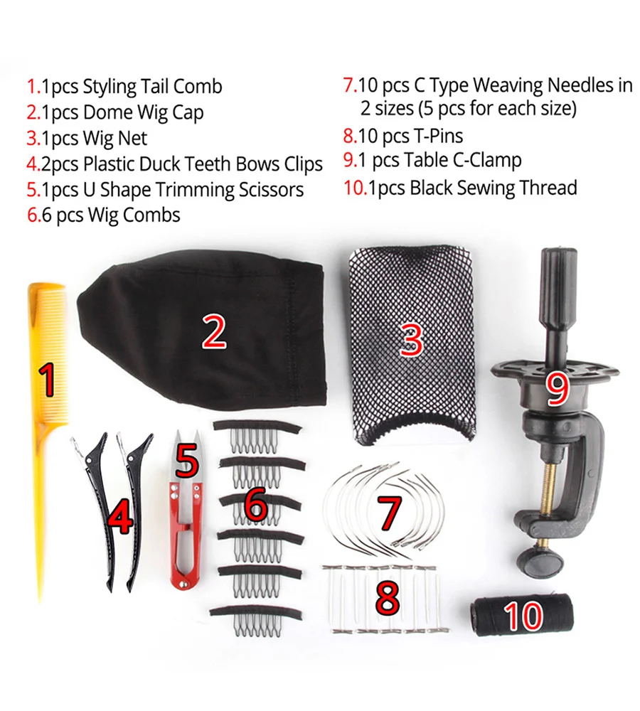1 шт Стильный гребень для хвоста, 1 шт купольная шапочка для парика, 1 шт сетка для волос, 2 шт Пластиковые зажимы для хвоста утки, 1 шт u-образные ножницы для обрезки, 6 шт гребень для парика, 10 изогнутых игл, 10 т-образных штифтов, 1 шт. Держатель головки парика, 1 шт. черная швейная нить