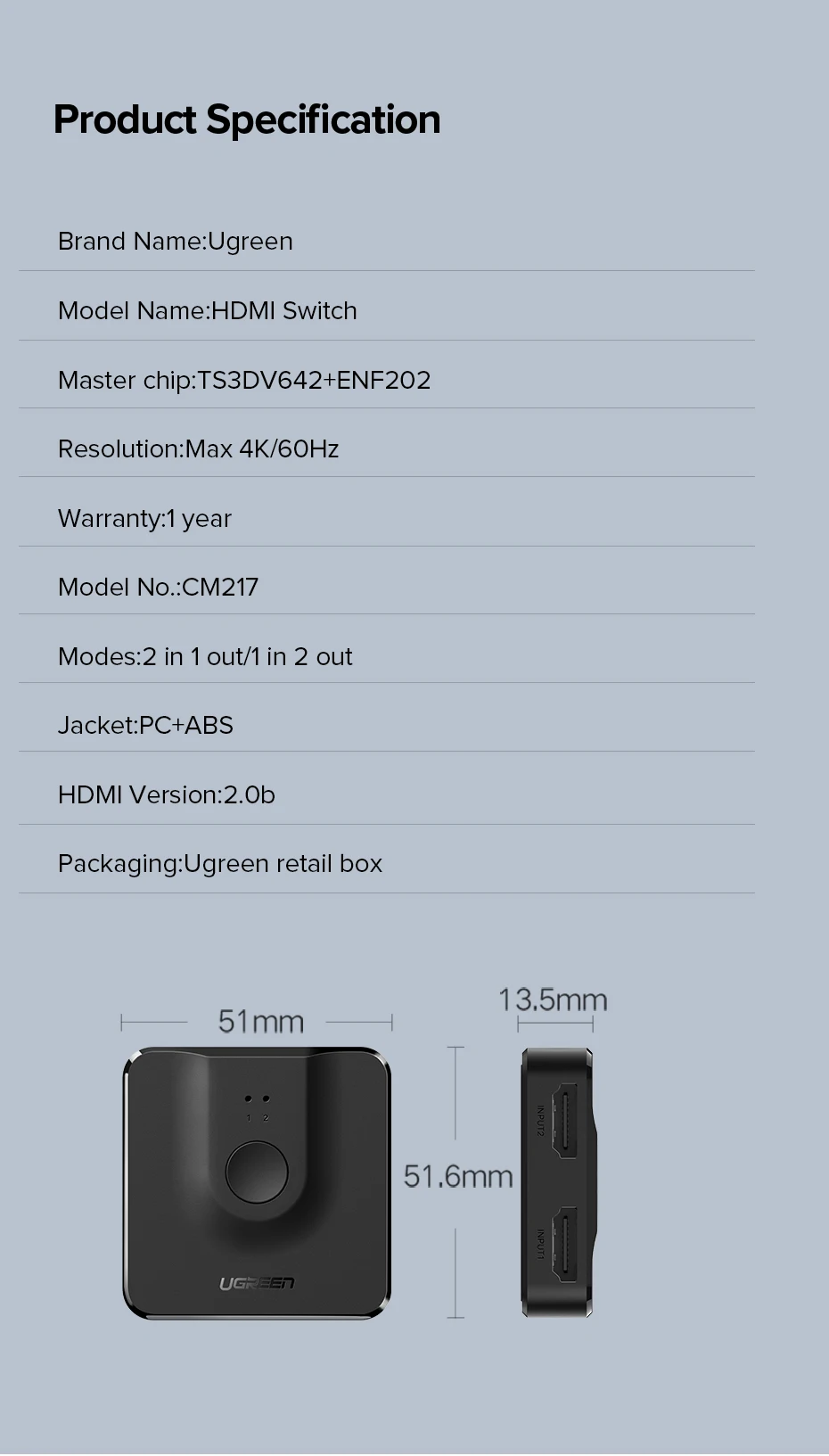 Двунаправленный HDMI переключательПереключатель Ugreen HDMI может выполнять двунаправленную работу, поможет подключить два источника HDMI к одному дисплею HDMI или подключить один источник HDMI для переключения между двумя дисплеями (2 монитора не могут отображаться одновременно.)