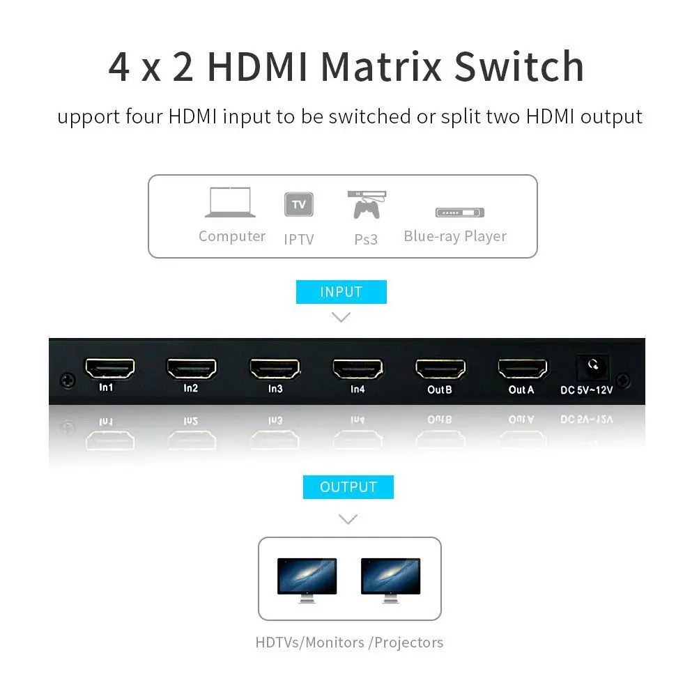 Эта матрица 4 в 2 из HDMI позволяет подключать 4 входа к 2 HDTV/мониторам/проекторам одновременно. Поддержка четырех hdmi-входов для переключения или разделения двух HDMI-выходов.
