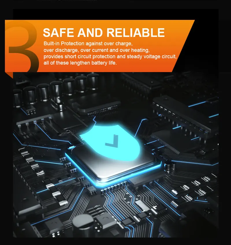 Безопасная и надежная: встроенная защита от перезарядки, разрядки, перегрузки по току и перегрева обеспечивает защиту от короткого замыкания и стабильное напряжение цепи, все это продлевает срок службы батареи.