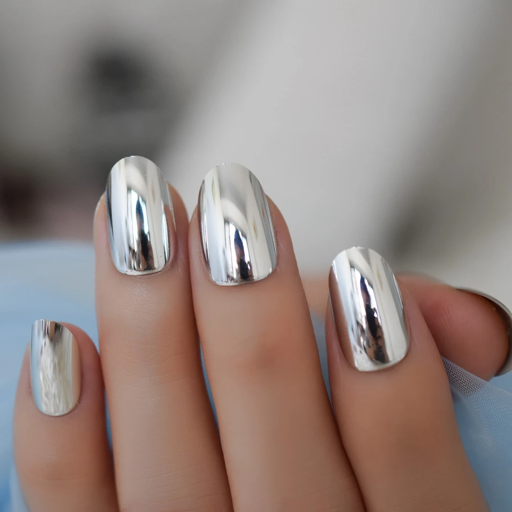 24 шт Серебряные средние искусственные полностью изогнутые ногти Металлические овальные девушки поддельные ногти зеркальные крутые накладные ногти с наклейкой на клей