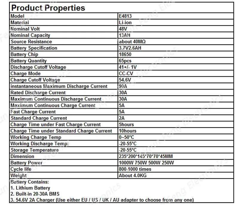 Блок батарей для электрического велосипеда, из ПВХ, 48 В Литий-ионный аккумулятор для электровелосипеда, подходящий для двигателя, безредукторного двигателя, бесщеточного двигателя постоянного тока и т. д. Подходит для мотора bafang, мотора Tongsheng, золотого мотора и т. д. Характеристики аккумулятора электрического велосипеда: Номинальное напряжение: 48 В Номинальная емкость: 13Ah-21Ah 48 в 13 Ач Размер: 240*200*145*70*70*50 мм (разница: +/- 5 мм) 48 В 15,6 Ач Размер: 240*230*180*70*70*50 мм (разница: +/- 5 мм) 48 В 18,2 Ач Размер: 260*240*180*70-80*70*50 мм (разница: +/- 5 мм) 48 в 21 Ач Размер: 330*310*200*70-80*70*50 мм (разница: +/- 5 мм) Ячейки: мощные 18650 2000 мАч 2200 мАч 2500 мАч 2600 мАч BMS: 20A-50 ампер, непрерывный 50 ± 10 ампер, максимальный Подходящий двигатель, мощность: 48 В, 150 Вт, 200 Вт, 250 Вт, 300 Вт, 400 Вт, 500 Вт, 650 Вт, 750 Вт, 800 Вт, 1000 Вт, 15000 Вт, 1800 Вт, 2000 Вт Ток зарядки: 3-5A Напряжение отключения зарядки: 54,6 в Критическое разрядное Напряжение: 40V Температура разряда: от-20 до 65 °C Температура зарядки: от 0 до 65 °C Срок службы: ≤ 80% емкость после 800 циклов.Внимательно прочитайте следующие Примечания, чтобы обеспечить правильное использование литий-ионной батареи. Для предотвращения утечек аккумуляторов, взрывов, пожаров и т. д., пожалуйста, обратите внимание:-Не погружайте аккумулятор в воду и не мочите; -Не находится в источнике тепла (например, в огне или нагревателе), рядом с аккумулятором для использования или хранения; Пожалуйста, используйте оригинальное зарядное устройство; -Не обращайте вспять положительный и отрицательный электрод; -Не подключен к аккумулятору напрямую к розетке или гнезда прикуривателя автомобиля; -Не ставьте аккумулятор в огне или не нагревайте; Для запрещения использования проводов или других металлических предметов, будет запрещена короткое замыкание батареи, аккумулятор с ожерельем, шпилькой или другими металлическими предметами для транспортировки или хранения; -В результате механической вибрации, бросок или изготовление аккумулятора запрещена; Запрещена гвоздиком или другими острыми предметами, пронзенными оболочкой батареи, ударным молотком или батареей на педали; Клемма аккумуляторной батареи для прямой сварки; Аккумулятор должен быть запрещен каким-либо образом; Не рекомендуется заряжать аккумулятор при пожаре или в экстремальных условиях. -Не помещайте аккумулятор в микроволновую печь или сосуд под давлением; -С аккумулятором (например, батареями) или различной емкостью, типом, разнообразным комбинированным аккумулятором; -Не используйте аккумулятор, если есть запах, жар, деформация, обесцвечивание или какие-либо другие аномалии; Если аккумулятор работает или заряжается, должны быть немедленно удалены из электрических приборов или зарядного устройства и прекратить использование; -Аккумулятор должен быть помещен в недоступных для детей местах, если ребенок нечаянно глотает батарею, следует немедленно обращаться за медицинской помощью; Если батарея протекает или пахнет, ее следует сразу же снять, чтобы открыть; -Утечка электролита может вызвать пожар или взрыв; Если электролита аккумулятора после утечки в глаза, не трите краску водой, немедленно обратитесь за медицинской помощью. Если не вовремя, глаза будут болеть. Обратите внимание! Не используйте аккумулятор в тепловой среде, например, при прямых солнечных лужениях или нагреве автомобиля. В противном случае аккумулятор пер