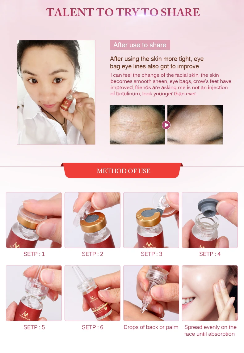 1. После очистки кожи Нанесите 1-2 капли оригинальных капель в челюсти. 2. С пальцами по лицу, лицу. 3. Мягко массируйте до абсорбции с обеих сторон, с кремом или лосьоном лучшего эффекта.