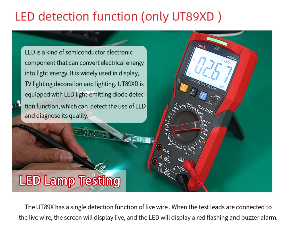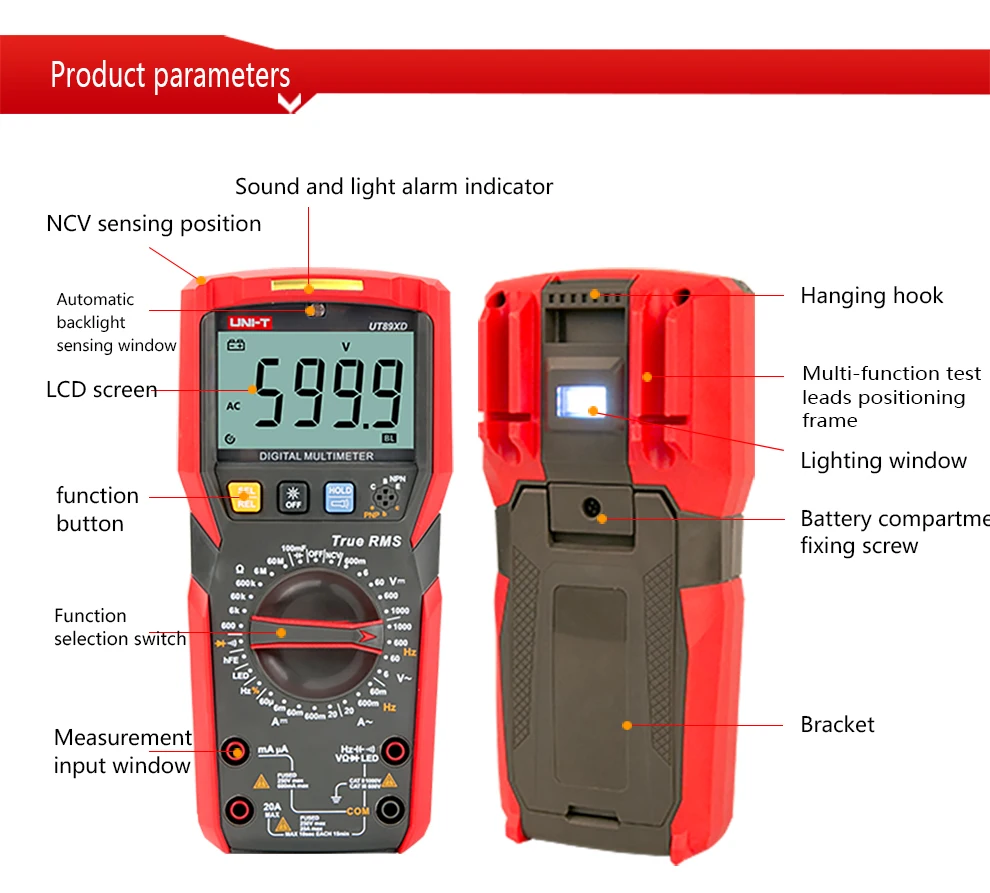 UT89X/UT89XD-это надежный Ручной цифровой мультиметр 35/6 бит с истинным RMS измерением синусоидальной волны. Можно измерить макс.. 1000 В постоянного/переменного тока, макс. 20 А DC/AC Ток, сопротивление, емкость, частота, диод, hFE, непрерывность и NCV, быстрое точное разграничение между нейтральными и живыми проводами. UT89X может измерять температуру, обнаруживать нейтральные и прямые провода с тестовым проводом. UT89XD может выполнять светодиодный тест. Оснащенный звуковым и видимым сигналом, фонариком и функцией автоматической подсветки, эта серия может использоваться в темных условиях. Он привлекает пользователей своим двухцветным прочным чехол, современный внешний вид и множество функций. 1) двойная впрыска, прочная и эргономичная 2) Аудио/визуальная сигнализация (применяется при измерении напряжения, емкости, диода, транзистора, непрерывности, NCV/светодиодный) 3) Измерение напряжения до 1000 В 4) Измерение тока до 20 А 5) измерение NCV с уровнями напряжения может измерять напряжение до примерно 12 В переменного тока/50 Гц и различать прямые/нейтральные провода по датчику 6) измерение емкости до 100 МФ 7) Светодиодный индикатор может выдержать напряжение около 12 В/5 мА 8) ЖК-дисплей с автоматической подсветкой и фонариком Подарки включают в себя 1 пара * датчики для мультиметра, 1 пара * Зажимы Типа аллигатора (UT89X/UT89XD) 1 Оригинальная сумка, 1 пара зажимов типа «Аллигатор» (UT89X/UT89XD с сумкой)