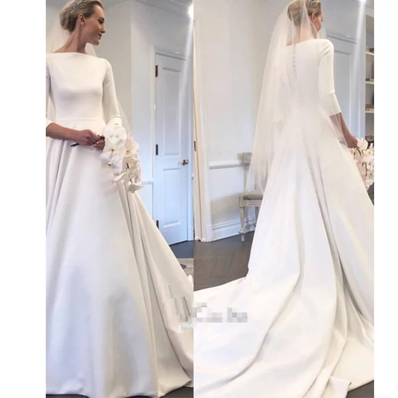 Элегантные атласные свадебные платья трапециевидной формы с рукавами три четверти на молнии и пуговицами сзади, простые дешевые платья Vestido De Noiva