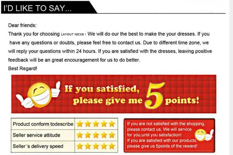 A. Высота =___ см или дюймах B. От плеча до пола (без обуви) =____ см или дюймах C. Бюст = _ см или дюймах D. Обхват талии =____ см или дюймах E. Бедра. _ см или дюймах Упаковка и доставка Обычно мы используем DHL, ТНТ, UPS, EMS и некоторые другие методы, мы выбираем безопасный, быстрый и дешевый способ доставки для вас. После отправки продукции для вас мы сообщим вам номер для отслеживания. И веб-сайт для отслеживания посылки по электронной почте. Как правило, время доставки составляет, как показано ниже, однако для некоторых дальних стран, это займет больше времени, чтобы прибыть. DHL:3-5 рабочих дней. Dhl.com/ UPS:3-5 рабочих дней. Ups.com EMS:6-9 рабочих дней. Ems.com.cn Долл. США с учетом TNT:6-9 рабочих дней. Tnt.com Aramex:5-7 рабочих дней. Aramex.com Информация о возврате товара и процесса 1. В том случае, если вы обнаружите, что Платье-это не тот цвет или размер, пожалуйста, отправьте нам четкие фотографии в течение 7 рабочих дней с момента получения Платье. Мы не можем получить его и вернуть вам деньги или изменить Платье после нашего подтверждения; 2. В том случае, если Платье дефекты поверхности, с оригинальным рисунком, то, пожалуйста, отправьте нам четкие фотографии в течение 3 рабочих дней с момента получения Платье. Мы не можем получить его и вернуть вам деньги или изменить Платье после нашего подтверждения; 3. Если у вас есть очевидная проблема с качеством Платье, например большое пятно, поврежденная или дефектная поверхность, пожалуйста, отправьте нам четкие фотографии в течение 3 рабочих дней с момента получения Платье. Мы не можем получить его и вернуть вам деньги или изменить Платье после нашего подтверждения; 4. Мы предлагаем бесплатный ремонт вашего изготовление под заказ платье даже если ремонт необходим потому, что вам предлагают нам неправильные замеры! Но вам нужно оплатить стоимость доставки. Производственный процесс