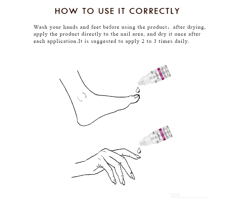 1. Мойте руки и ноги перед использованием продукта, после высыхания. 2. Нанесите изделие непосредственно на область ногтей и высушите его один раз после каждого нанесения. 3. Рекомендуется применять 2-3 раза в день.