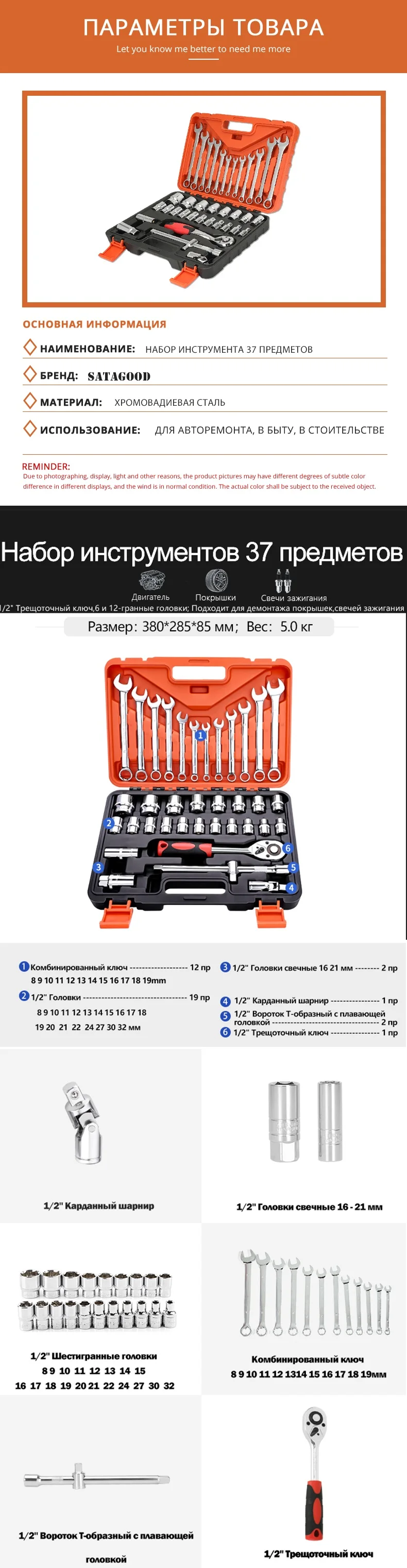 Бренд: SATAGOOD Название: SATAGOOD G-10010 Набор инструментов 37 предметов Инструменты Набор инструментов для ремонта автомобиля Тип: Торцевые головки Тип: Разъемы Тип: фотография Тип: Гаечные ключи