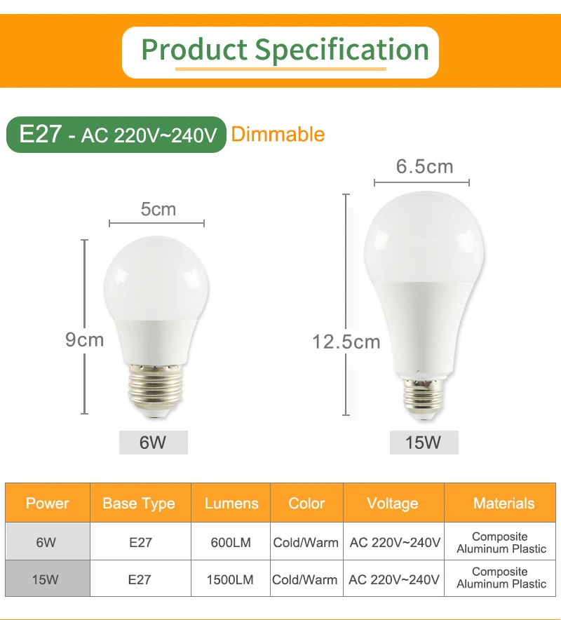 Название товара:Светодиодная лампаТип цоколя:E27Напряжение:220-240 В переменного токаМощность:6 Вт/15 Вт• Цветовая температура:Теплый белый: 2800-3200KCold белый: 6000-6500KГарантия:1 год• Индекс цветопередачи:Ra >85