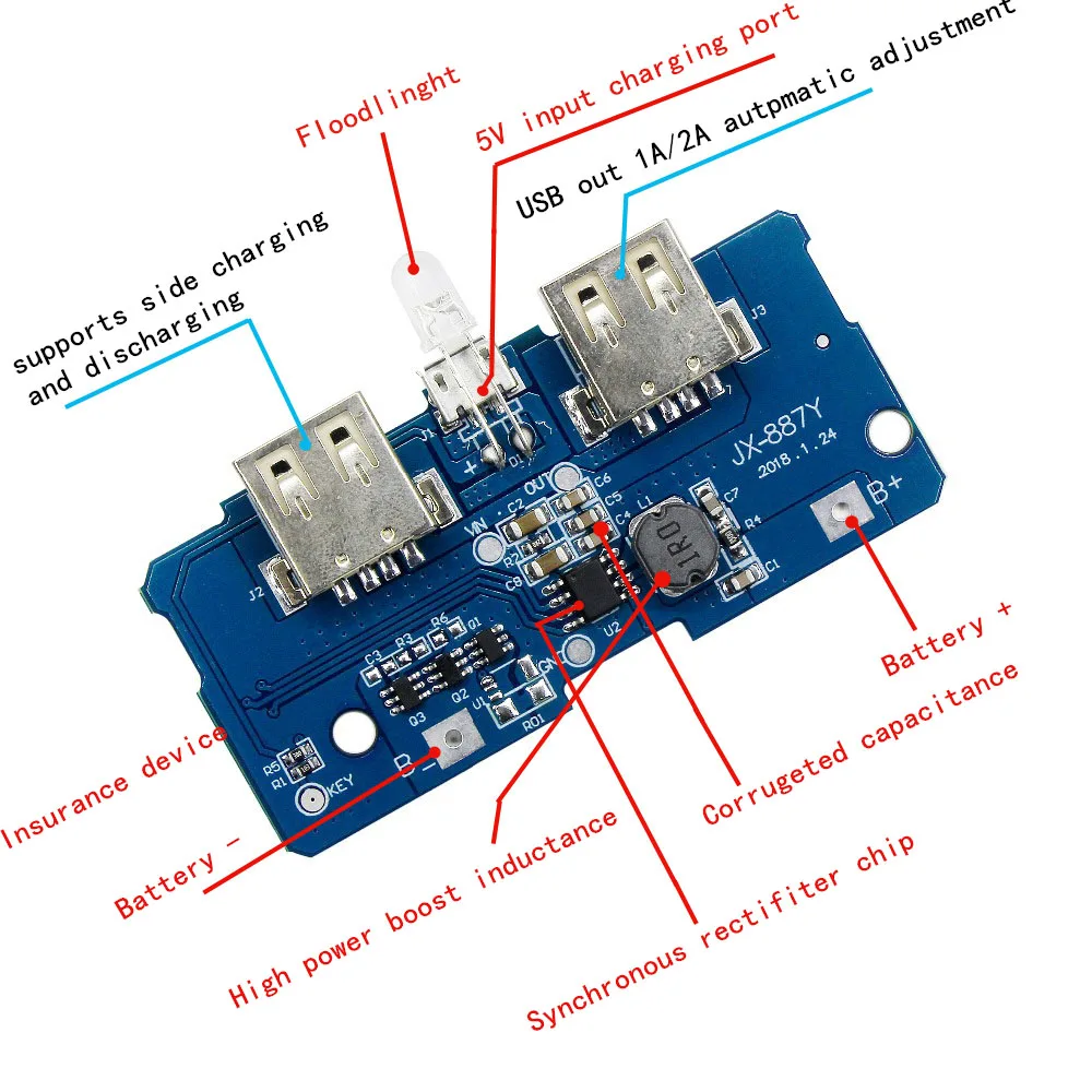Светодиодный индикатор показывает мощность, нерабочее состояние интеллектуального автоматического отключения;Двойной выход USB.Встроенная литиевая батарея защиты IC, перегрузки по току, перенапряжения, защиты от низкого напряжения;18650 литий-ионный аккумулятор Двойной микро-usb booster board параметрВходной порт: MicroUSB (рот Эндрюса)Требования к входу: 5 в источник постоянного тока может быть сделан для зарядки входного источника питания, наиболее с соответствующим зарядным устройством для 5V1A вышеВыходной порт: USBПараметры выхода: 5V1A/5V2AРазмер: 8X32X69 мм (В * Ш * Д)18650 литий-ионный аккумулятор Двойной микро usb booster плата требования для аккумуляторов:В наличии Батарея: 18650 батарея, сотовом телефоне батарея, плоские батареи, MP3 батареи и т. д. 3,7 V-4,2 V полимерная литиевая батарея может быть одна секция (чип) источника питания, также может быть многосекционные (чип) С параллельным подключением источник питания (не в серии, не в серии). (Примечание: увеличение емкости параллельно, серия заключается в повышении напряжения, может использоваться только параллельно!)Может быть параллельная батарея 18650 2-6.Не указан Батарея: сухой аккумулятор и зарядное устройство 1,2 V аккумуляторные батареи, никель-металл-гидридный аккумулятор и зарядное устройство 3,2 V литий-полимерный литий батареи.18650 литий-ионный аккумулятор Двойной микро usb booster board установка должна обратить внимание на следующую точкуБатарея должна быть параллельно напряжения между 3,2-4,2 V для работы, 18650 Без Каблука и полимерные батареи может быть;Аккумулятор подключен к материнской плате B + отрицательный доступ B-, установленная противогорящая материнская плата;Старые и новые батареи, модели, непоследовательный бренд батареи не может быть смешан.![]()