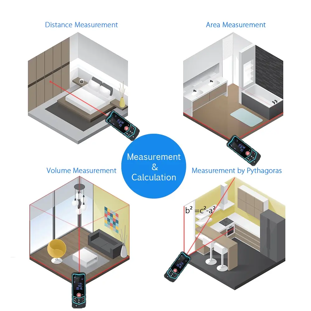 Ручной перезаряжаемый лазерный дальномер: Электронный угол, заменяющий пузырьковый уровень, оснащенный датчиком наклона, многократное переключение вычислений с лазерного измерения на колесо (измерение одной/площади/объема) с помощью одной руки.