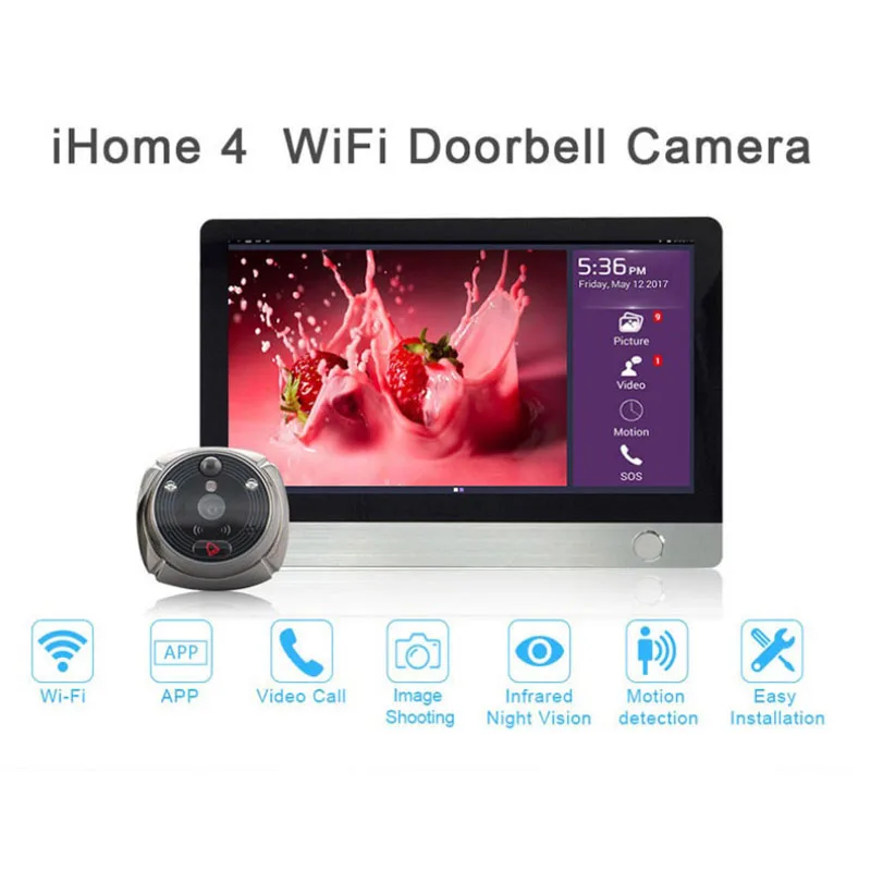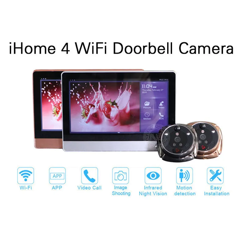 1 1024x600 HD емкостный экран 2 сверхпродолжительное время работы в режиме ожидания 3 Wi-Fi видеочата и уведомления приложений через приложение Android/iOS на смартфоне и планшете 4 датчик движения: Автоматическое изображение захвата, когда посетитель остается впереди двери в течение определенного периода 5 видео Сообщений: посетитель может оставить видео Сообщение для хоста