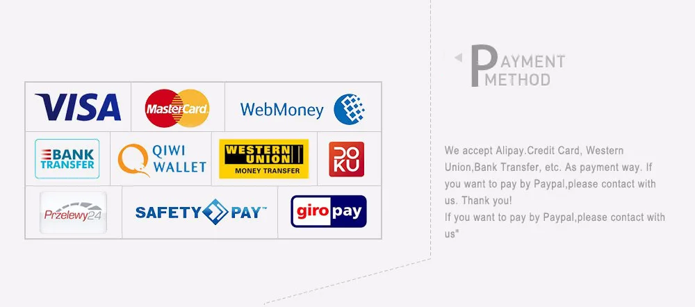 1. Мы используем Alipay здесь, все мировые платежные инструменты принимаются системой ESCROW, например Visa, Western Union, Money Booker, кредитной картой, кошельком Qiwi и банковским переводом и т. д. 2. Пожалуйста, завершите оплату в течение 3 дней после размещения заказа, и если у вас есть какие-либо проблемы с оплатой, пожалуйста, свяжитесь с нами.
