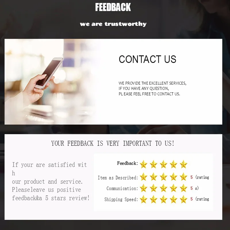 1. Ваше удовлетворение и положительные отзывы очень важны для нас. Пожалуйста, оставьте положительные отзывы и пять звезд, если вы удовлетворены нашими товарами и услугами в качестве поддержки для нас. 2. Если у вас есть какие-либо проблемы с нашими товарами или услугами, пожалуйста, не стесняйтесь связаться с нами, прежде чем оставить отрицательный отзывы. Мы сделаем все возможное, чтобы решить любую проблему и предоставить Вам лучшее обслуживание клиентов.