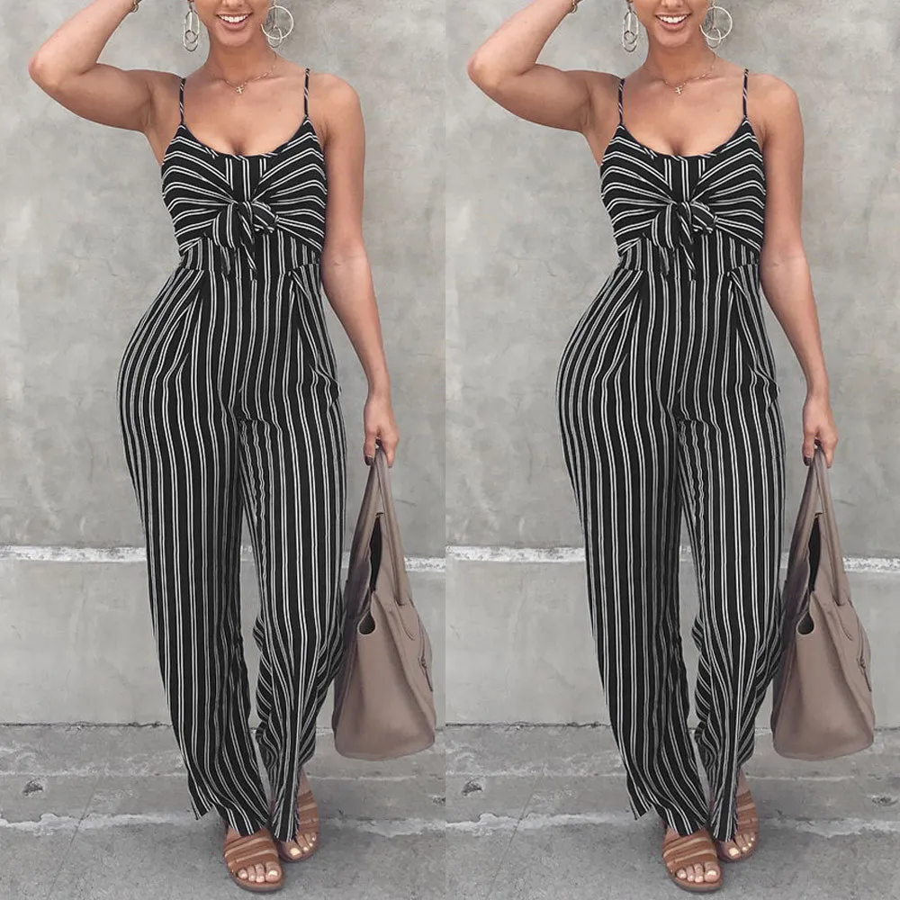Превратите свой новый сезонный гардероб в этот комбинезон с узлом. Модель с привлекательным узором в полоску, очаровательным узлом спереди и дизайном с завышенной талией, который показывает ваши красивые изгибы, бретельки, которые образуют сексуальный дизайн с открытой спиной, широкая нога и дизайн без рукавов, которые подходят для ношения летом.