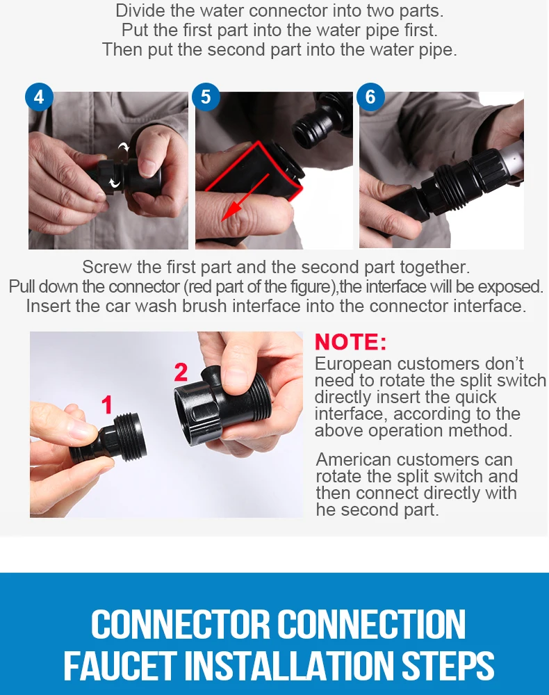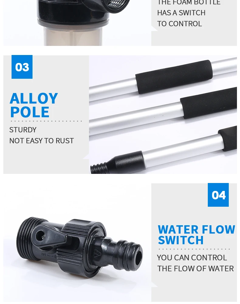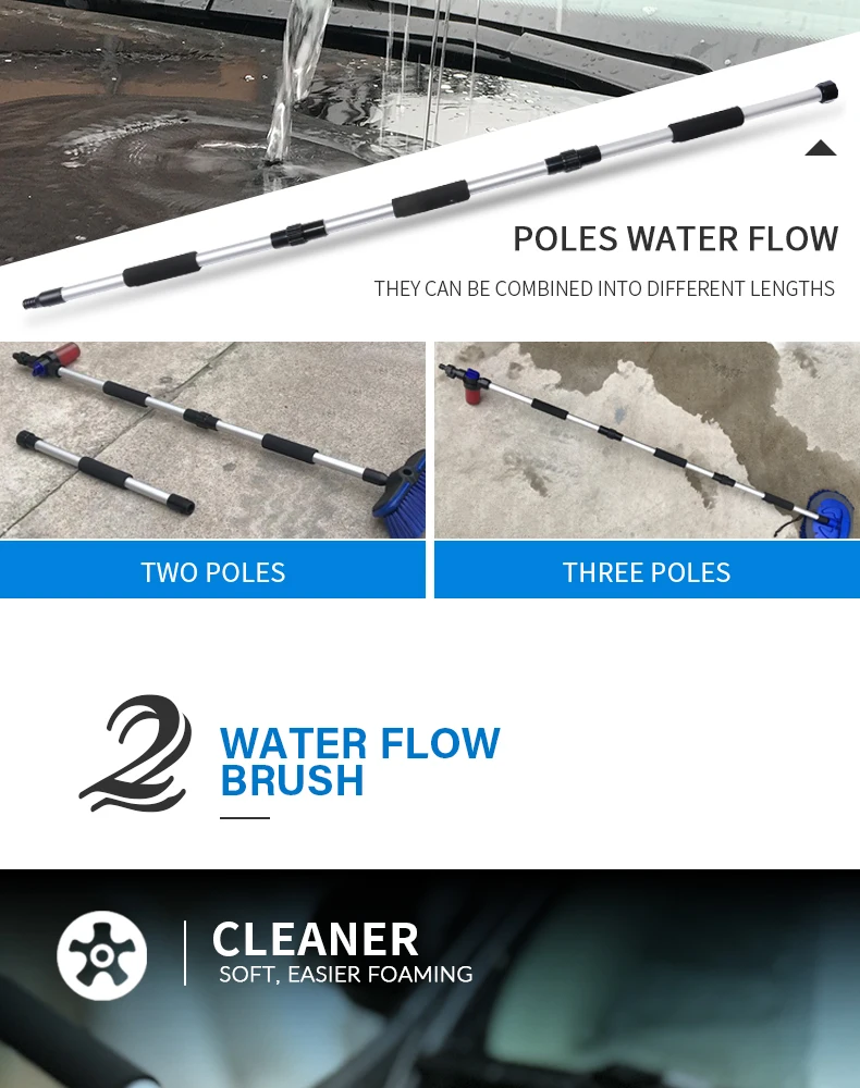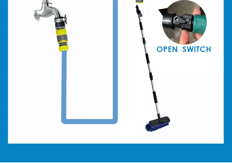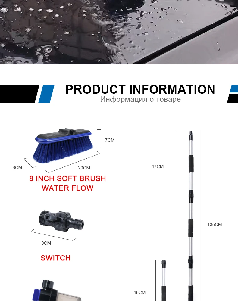 Общая длина: 135 см Рабочая высота: до 350 см Мягкая кисть: средняя нагрузка, Чистка автомобиля, грузовика, деревянная мебель Пенная бутылка: 150 мл Другие функции: подача воды, включение/выключение водяного клапана, сменные головки щетки Инструкция по применению L. Xammep кисти поставляются с адаптером для шлангов. Этот разъем совместим с любым шлангом, который использует эту систему. Убедитесь, что адаптер плотно вкручивается в кисти Xammep, а затем подключите его к адаптеру шланга. 2. Плотно удерживайте рукоятку кистей Xammep. 3.Xammep кисти поставляется с клапаном, который позволяет контролировать поток воды. Чтобы включить светодиоднyю подсветку с водой, пуш-ап, качающийся рычаг должен находиться в сторону рукоятки в положение ВКЛ. Чтобы выключить воду, нажмите рычаг в выключенное положение. Краткое описание продукции: 3-канальный ручка поток воды, 1 переключатель воды, 1 150 мл пены бутылки и 8 дюймов мягкую щетку.