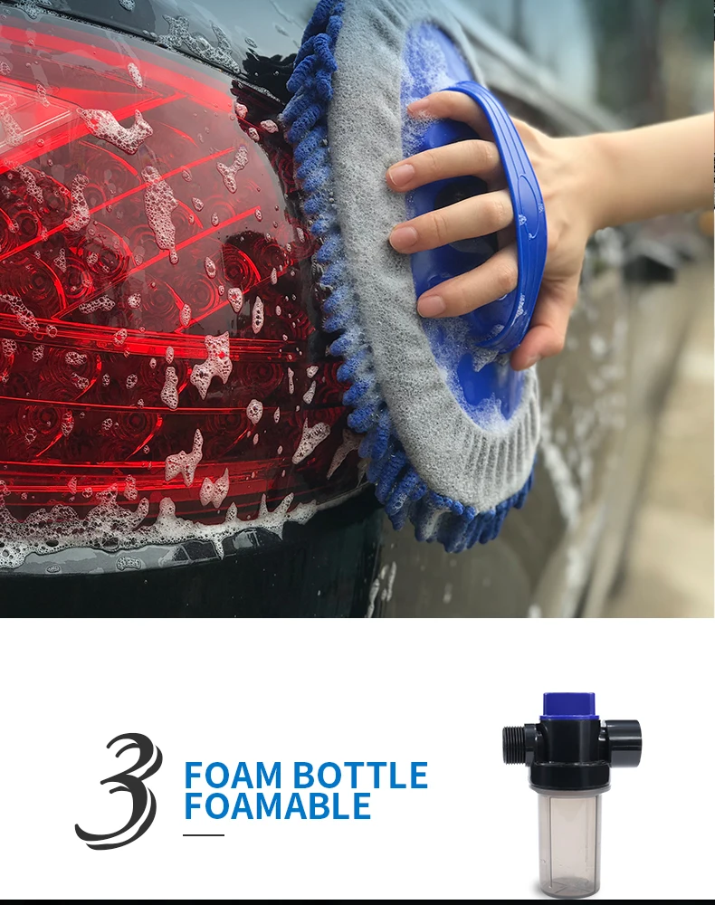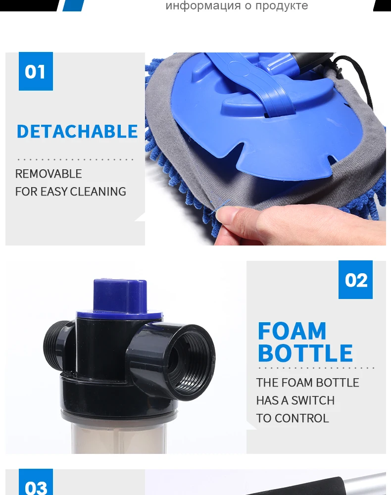 Швабра для мойки автомобиля, швабра из синели, метла, ворс, аксессуары для очистки автомобиля, чистящие инструменты Xammep Общая длина: 135 см Рабочая высота: до 350 см Мягкая кисть: средняя нагрузка, Чистка автомобиля, грузовика, деревянная мебель Пенная бутылка: 150 мл Другие функции: подача воды, включение/выключение водяного клапана, сменные головки щетки Инструкция по применению L. Xammep кисти поставляются с адаптером для шлангов. Этот разъем совместим с любым шлангом, который использует эту систему. Убедитесь, что адаптер плотно вкручивается в кисти Xammep, а затем подключите его к адаптеру шланга. 2. Плотно удерживайте рукоятку кистей Xammep. 3.Xammep кисти поставляется с клапаном, который позволяет контролировать поток воды. Чтобы включить светодиоднyю подсветку с водой, пуш-ап, качающийся рычаг должен находиться в сторону рукоятки в положение ВКЛ. Чтобы выключить воду, нажмите рычаг в выключенное положение. Краткое описание продукции: 3-канальный ручка поток воды, 1 переключатель воды, 1 150 мл пены бутылки, 1 оконный скребок, 1 автомойки шваброй и щетка для шин.