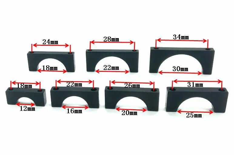 Размер зажима из углеродистой трубы 22 мм: расстояние между отверстиями 28 мм, ширина 34 мм, высота 29 мм, толщина 5 мм.