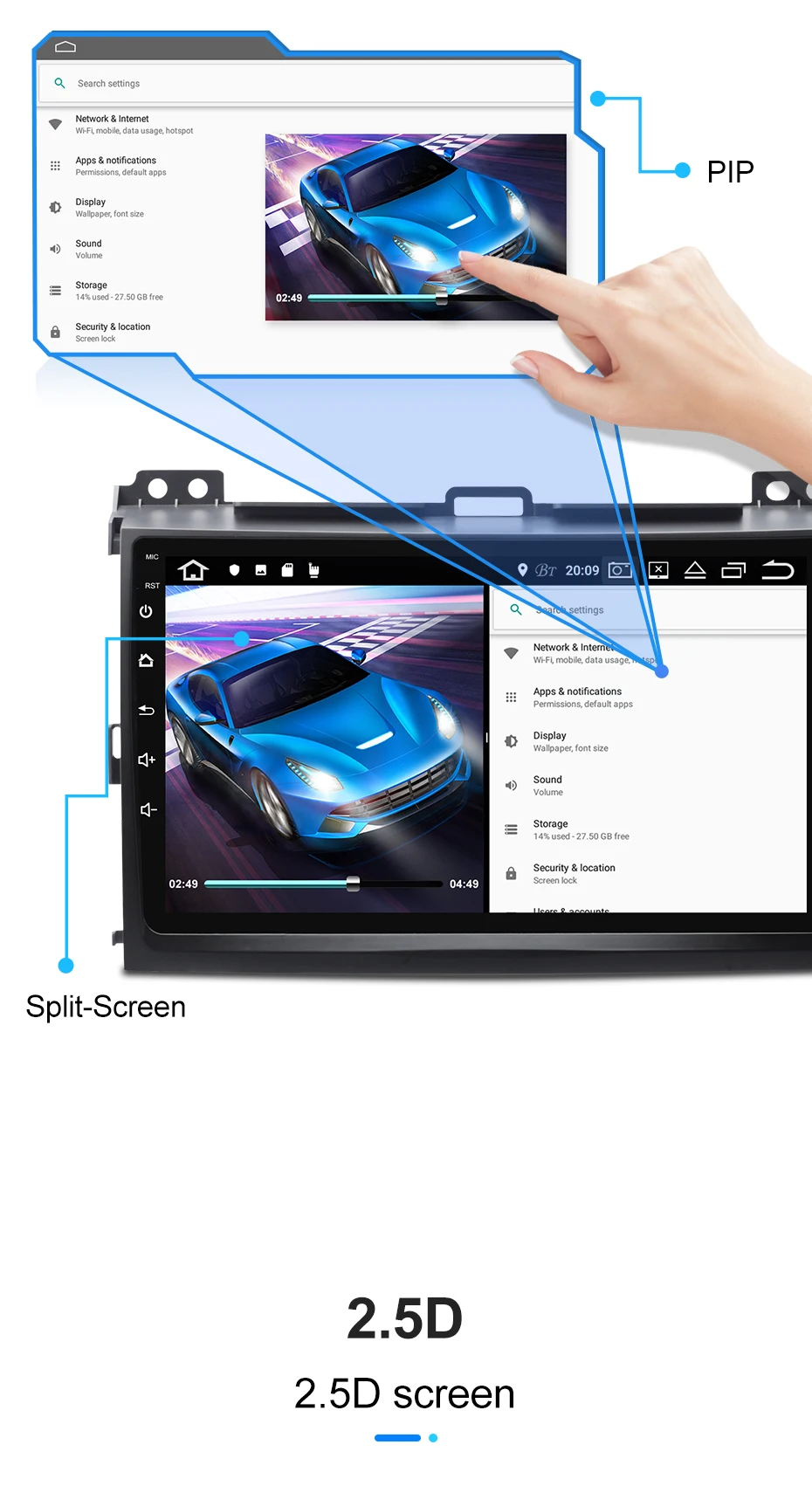 Картинка в картинке и разделенный экран >>> Видео всегда отображается во вложенных окнах, вы можете установ ить размер видеоинтерфейса по своему усмотрению. >>> Экран головного устройства может отображать два приложения одн овременно. (не может одновременно отображать два аудио приложения)