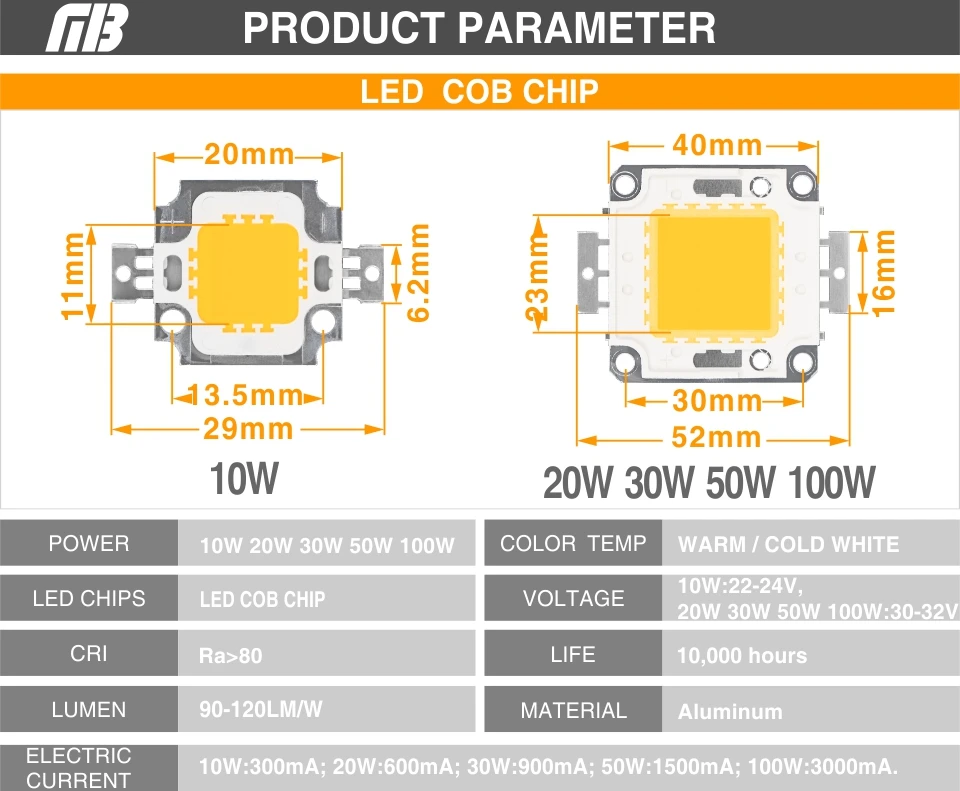Описание товара: Название продукта: светодиодный чип высокой мощности Ватт: 10 Вт 20 Вт 30 Вт 50 Вт 100 Вт Цветовая температура: теплый белый (2800-3500K) белый (6000k-6500K) Световой поток: 90-110 лм/Вт Ток Foward: 10 Вт (300мА); 20 Вт (600мА); 30 Вт (900мА); 50 Вт (1500ма); 100 Вт (3000 мА) Напряжение драйвера: 10 Вт: 22-24 В, 20-100 Вт: 30-32 в Внимание: для охлаждения требуется радиатор из алюминия, не светильник без радиатора из алюминия.
