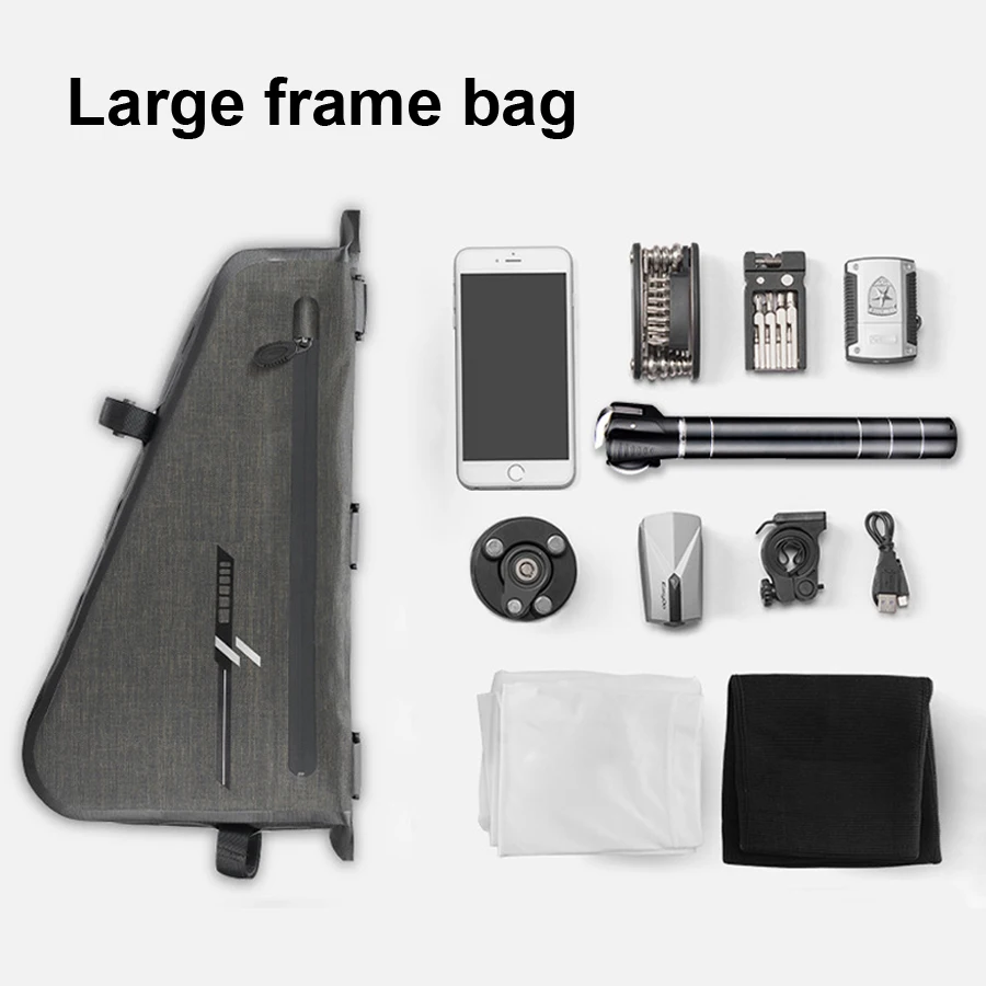 [Сумка для велосипедной рамы] Водонепроницаемость: IPX67 Материал: ТПУ Вес: 0,32 кг Размер: 40*23*40 см Толщина: 6 см Доступная емкость: 5-6 л Это Сверхлегкая сумка большого размера, изготовленная в основном из водонепроницаемого материала и стойкого к истиранию нейлона из ТПУ и 840D с внутренней сетчатой сумкой.
