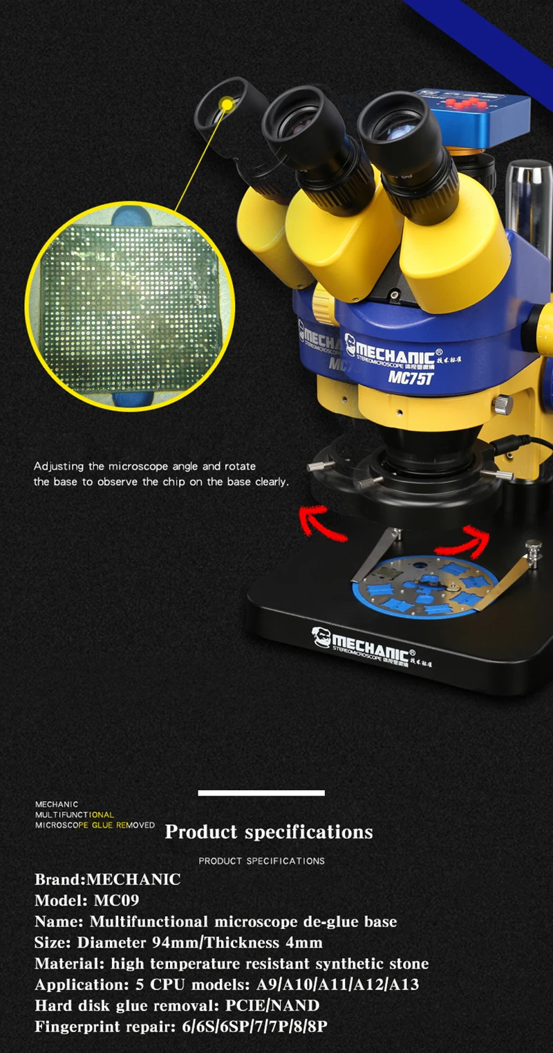 Описание: -- Быстро и легко устанавливается, точность в положении, не снимается и не ослабляется -- Регулировка угла микроскопа и поворот основания для четкого наблюдения за чипом на основании -- Высокотемпературный устойчивый синтетический камень Функция: 1: датчик отпечатков пальцев для ремонта для iPhone 6/6P/6S/6SP/7/7P/8/8P 2: Поддержка 5 виды Процессор: A9 A10 A11 A12 A13 3: функция открытия датчика отпечатков пальцев