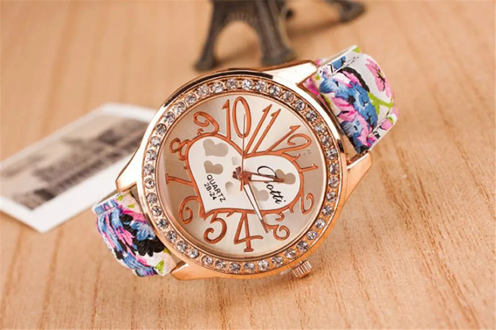 Модные роскошные женские часы с сердечком и цветочным узором, кожаный ремешок, Женские Кварцевые аналоговые наручные часы reloj