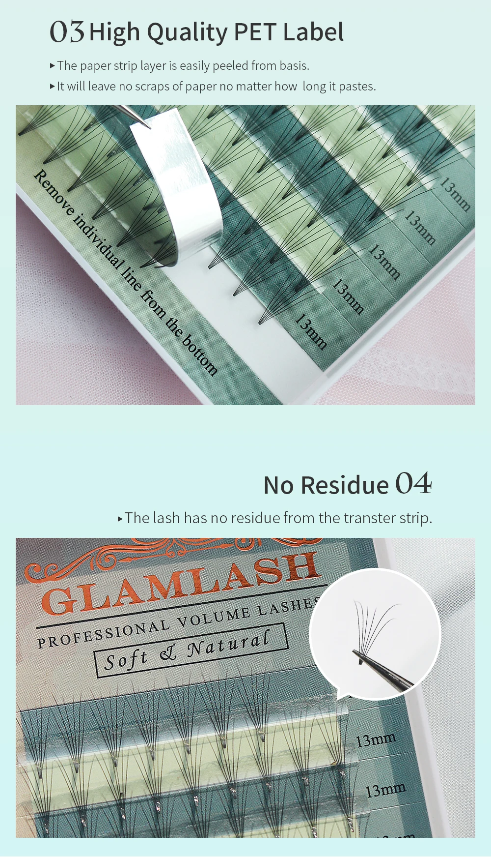 GLAMLASH 2d/3d/4d/5d/6d широкие вентиляторы более открыты, чем обычные вентиляторы, и поэтому наши широкие вентиляторы создадут мягкий и перфорированный общий вид. Наши широкие вентиляторы имеют очень малое ровное тонкое дно, вентиляторы нагреваются, поэтому нет клея. Поэтому они очень хорошо соединяются с естественными ресницами и точки соединения ресниц бесшовные и выглядят очень естественно на глазах.