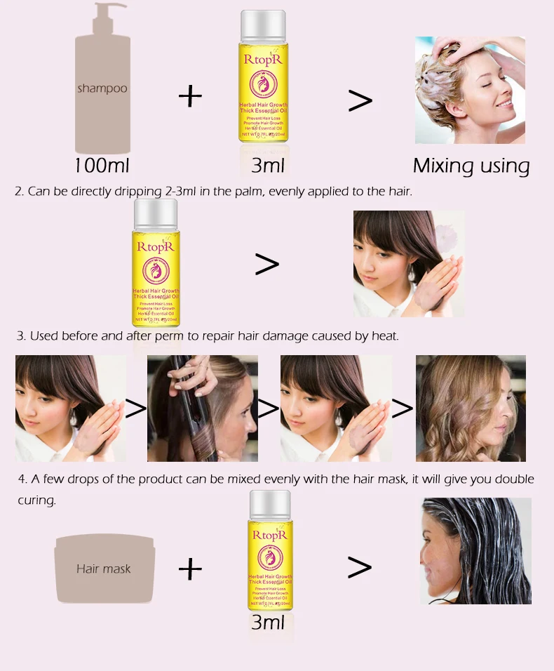 1. После мытья волос на влажных волосах требуется соответствующее количество этого продукта 2. Мягко массируйте, чтобы ускорить впитывание, увеличить блеск волос, не нужно мыть снова. 3. Он также может быть применен к корням волос, мягко массирует для ускорения поглощения и способствует росту волос без ополаскивания.