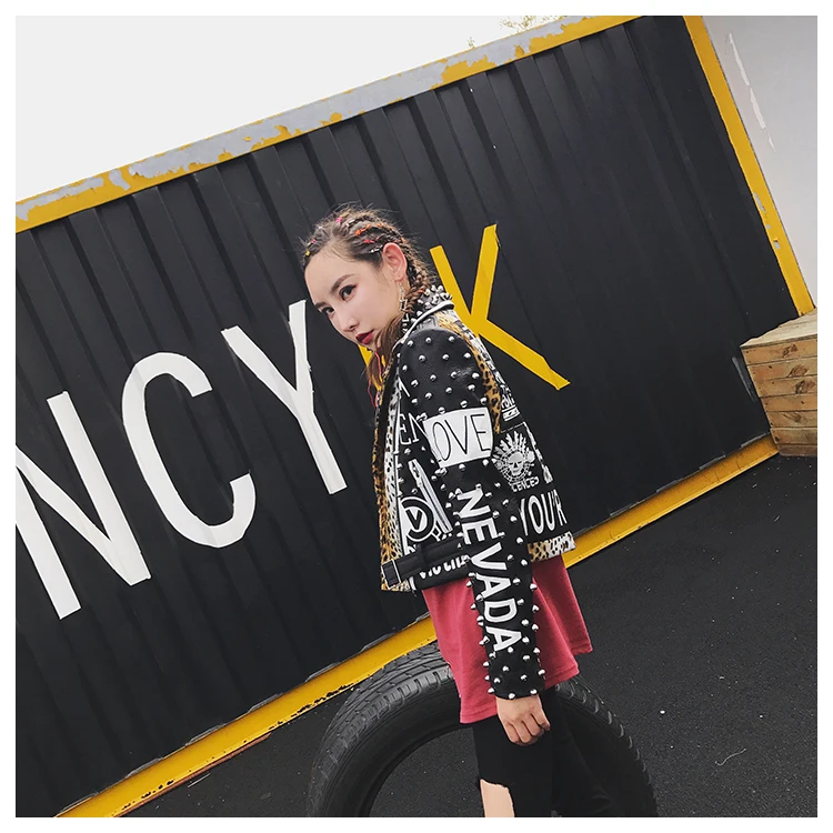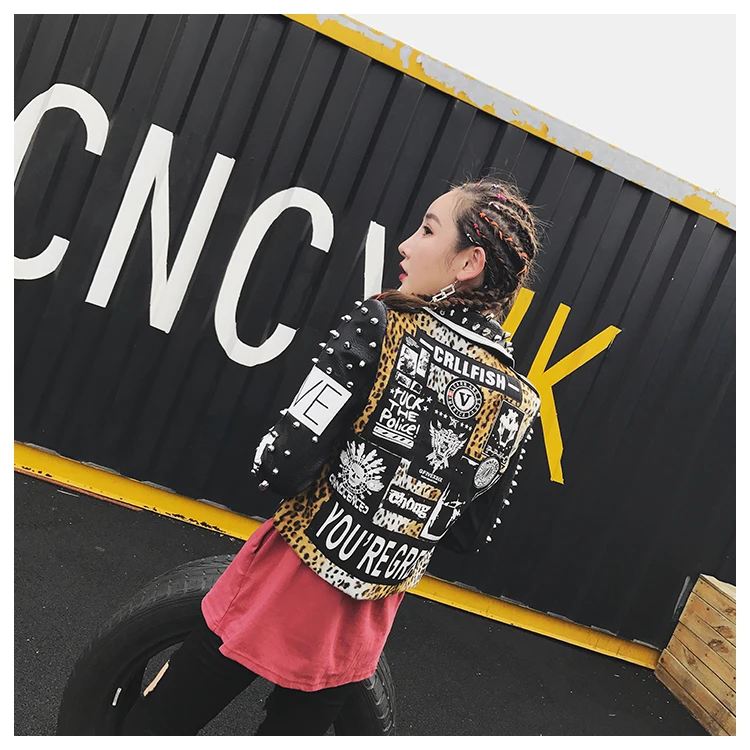 QING MO, куртка из искусственной кожи с заклепками, Женская леопардовая куртка из искусственной кожи, куртка с высокой талией и длинными рукавами, весеннее пальто с буквенным принтом и искусственным поясом, ZLDM057